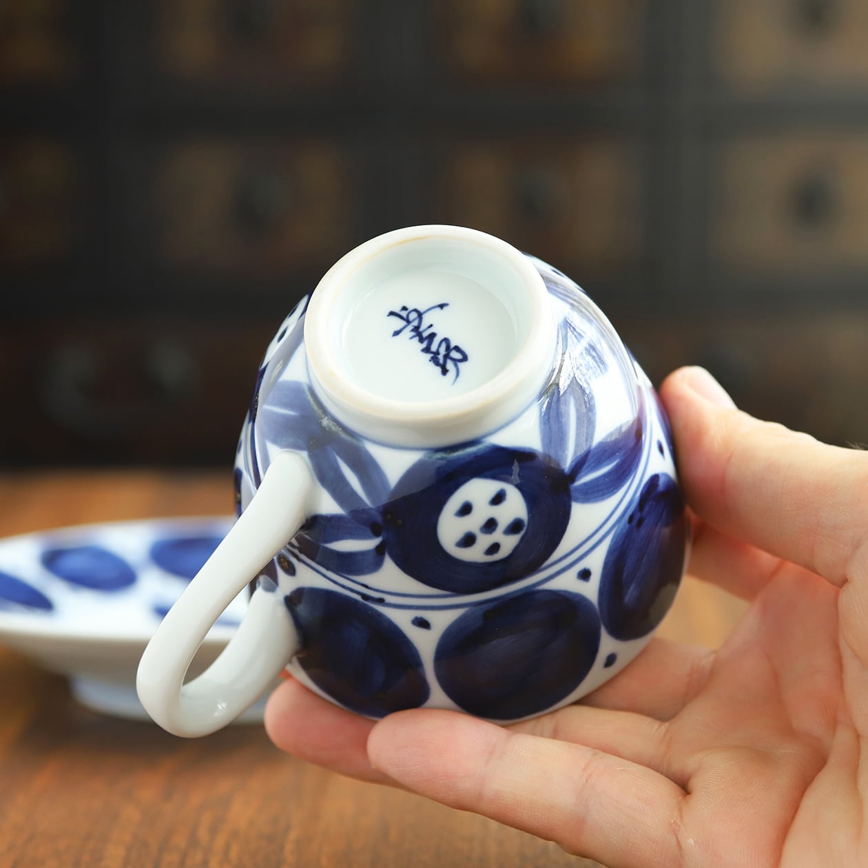 濃淡のある鮮やかな藍色は、有田焼ならではの透明感のある白磁に映え、格調高い美しさを放ちます。カップの側面やソーサー全体に配された花丸紋は、どの角度から見ても楽しめるように工夫されており、手に取るたびに新たな発見があるでしょう。