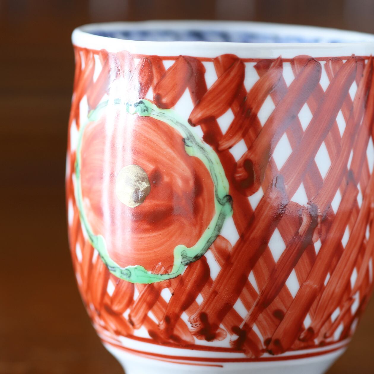 伝統の赤絵と金彩の輝きが融合した、松尾貞一郎さんの赤絵地紋湯呑。古典の美を受け継ぎながらも現代の暮らしに映える、唯一無二の逸品です。