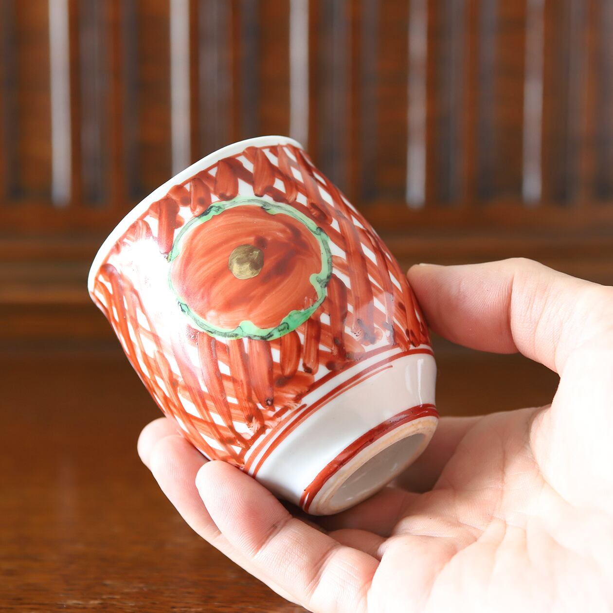 このお湯呑はすべてロクロで一つひとつ成形され、表面には手作業ならではの柔らかな揺らぎが残ります。機械では決して生み出せない温かみと、作家の息づかいを感じさせる質感が、赤絵と金彩の華やかさに自然な奥行きを添えています。