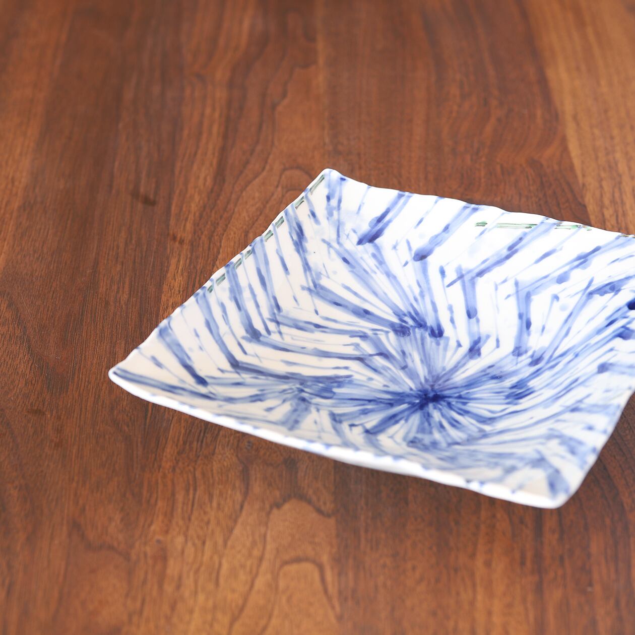 有田焼の名窯・貞土窯で制作されたこちらの角鉢は、染付による大胆な渦文様が目を引く一品です。筆の勢いを感じさせる線描が、器全体に力強い動きを与え、食卓にモダンなアクセントを添えます。さらに二辺の縁にだけ金彩を加えることで、全体のデザインにさりげない華やかさと上品な輝きをプラス。