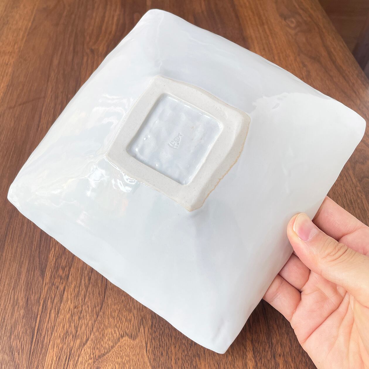 重さは約370g。手にしたときに安心感を与えてくれる程よい重量がありながら、普段使いにも適した扱いやすさを持っています。角鉢のすっきりとしたフォルムは料理を美しく見せ、特にモダンな盛り付けやおもてなしの料理にもしっくり馴染みます。