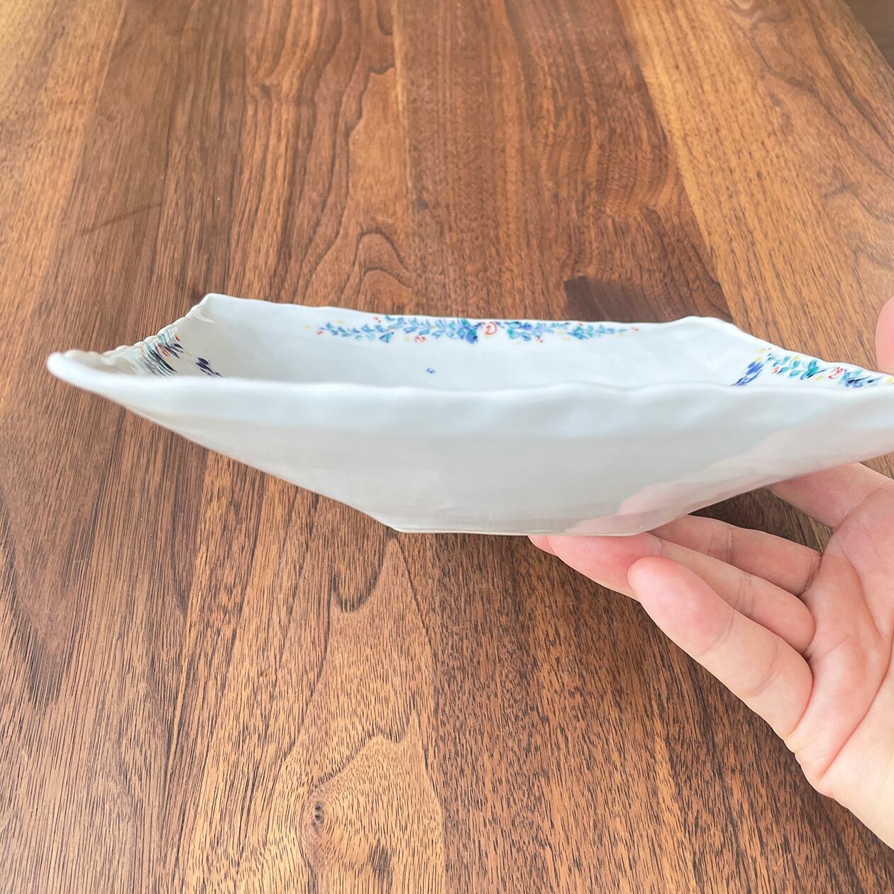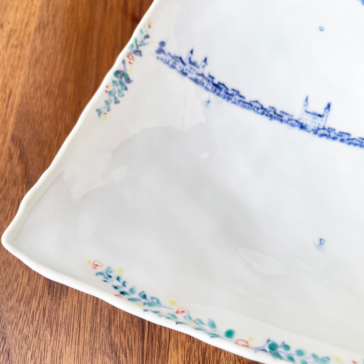 器の縁には色絵で華やかに唐草文様が描かれ、鮮やかな彩りが四方を取り囲みます。そして中央部分には、染付によって湖畔の向こうに浮かび上がるヨーロッパの街並みが表現されています。藍の濃淡で繊細に描かれた街並みは幻想的な雰囲気を漂わせ、色絵の唐草と美しい対比を生み出しています。華やかさと静謐さが同居する構図は、まるで物語の一場面を映したかのようで、器そのものが一幅の絵画のような趣を持っています。