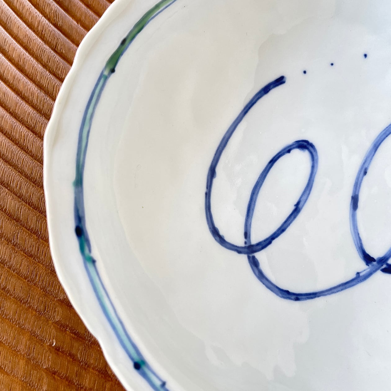 見込み中央に舞うように配された青のラインは、余白の美しさを引き立て、器に軽やかなリズムを生み出しています。縁まわりには緑や黄色の淡い彩色がさりげなく添えられ、柔らかな表情と奥行きを感じさせます。松尾貞一郎さんらしい、伸びやかで遊び心のある絵付けが魅力の一品です。