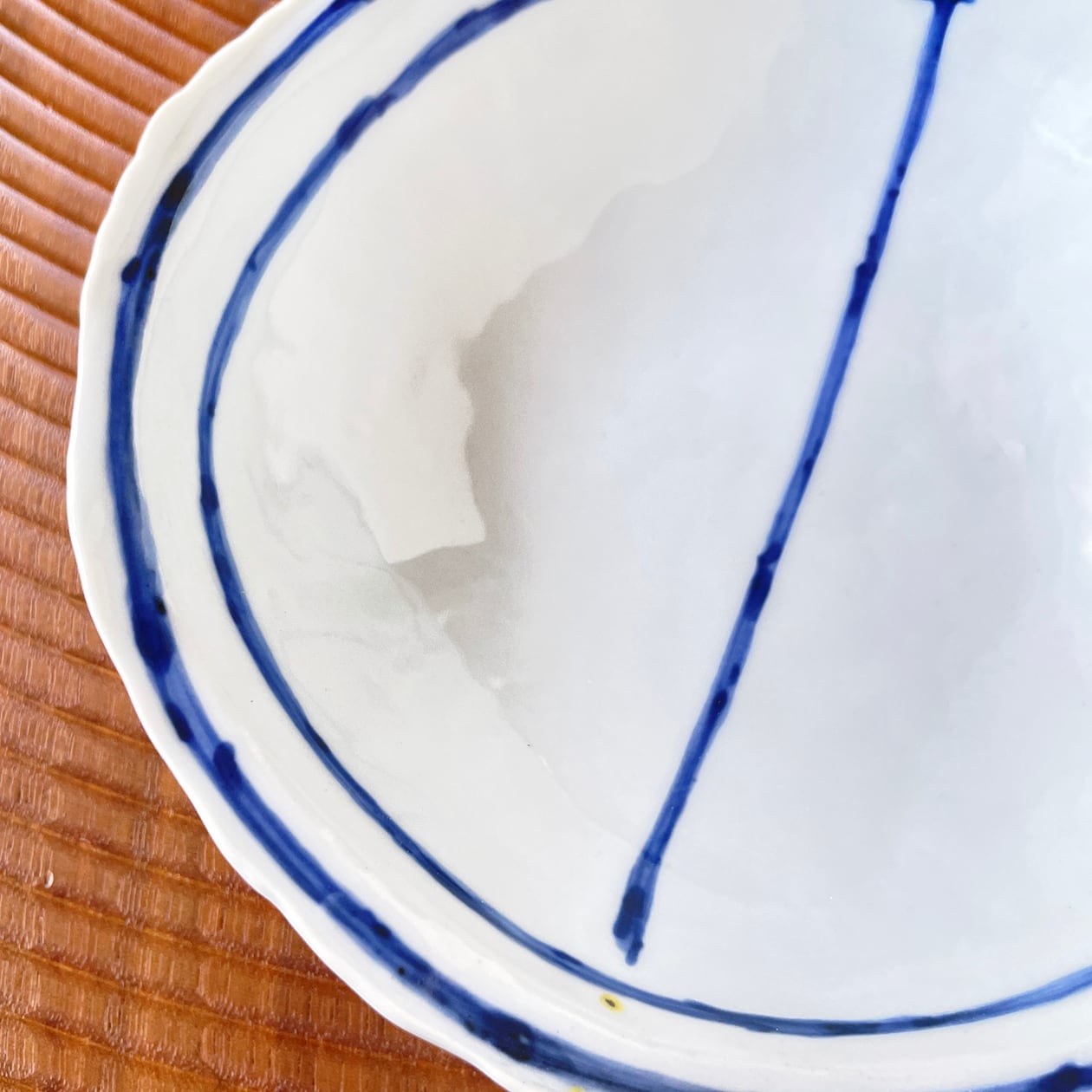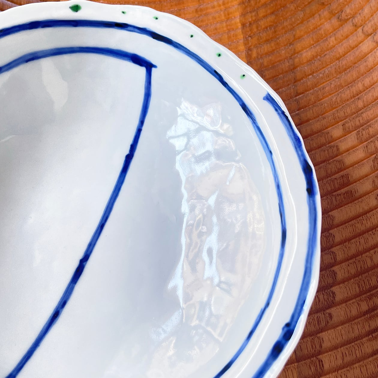 白磁の余白を生かし、藍の線でシンプルに構成された意匠が目を引く浅鉢です。見込みにはまっすぐな縦の線と、緩やかな弧を描く二重の円弧が組み合わされ、抽象的でありながらも軽快なリズムを感じさせます。縁をめぐる藍のラインには緑の点がさりげなく加えられ、素朴さの中に遊び心が光ります。松尾貞一郎さんらしい伸びやかで現代的な感覚が表れた一品です。