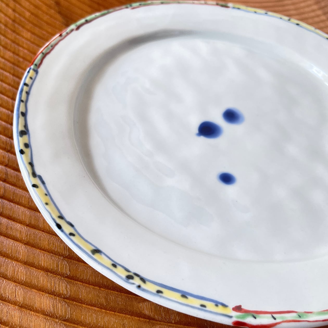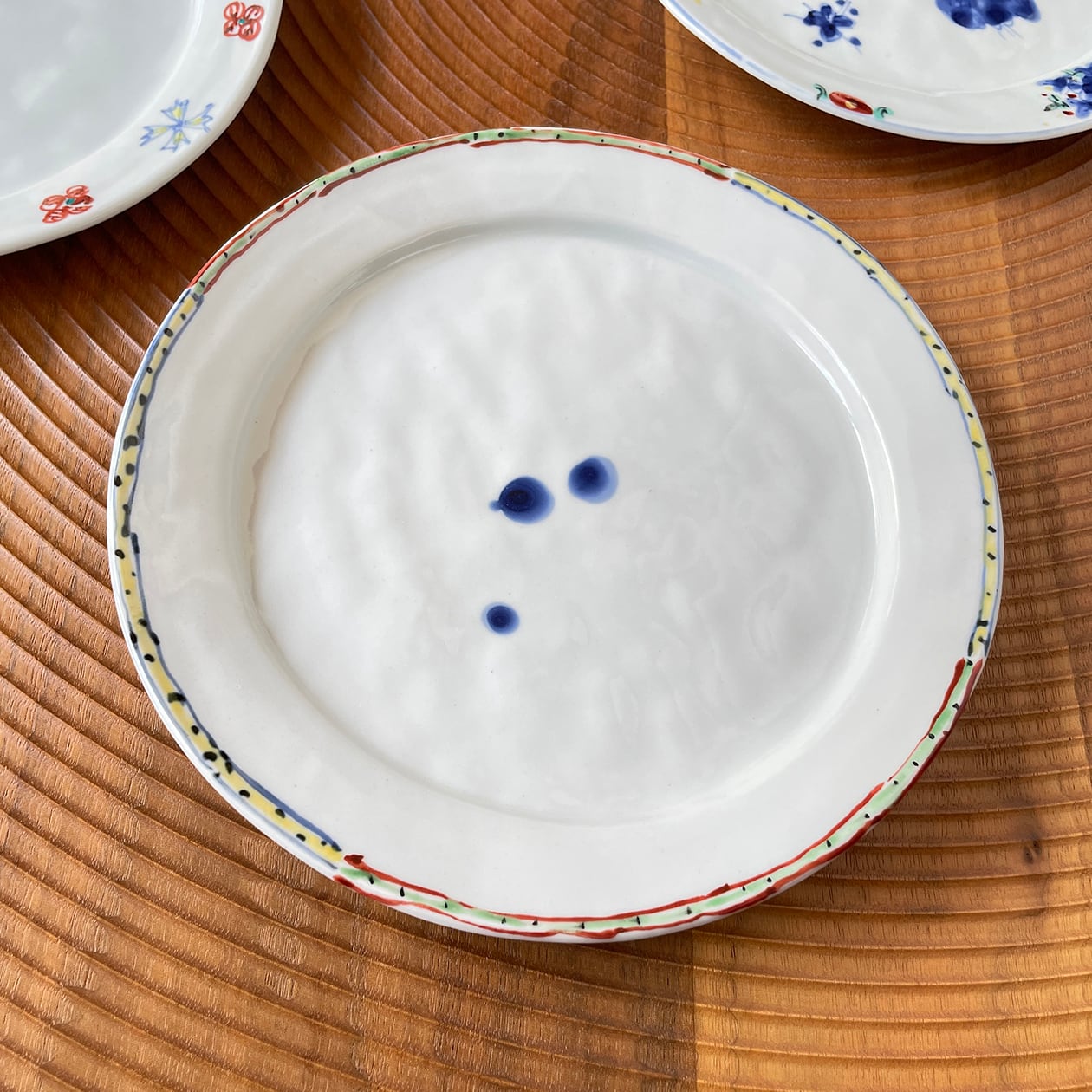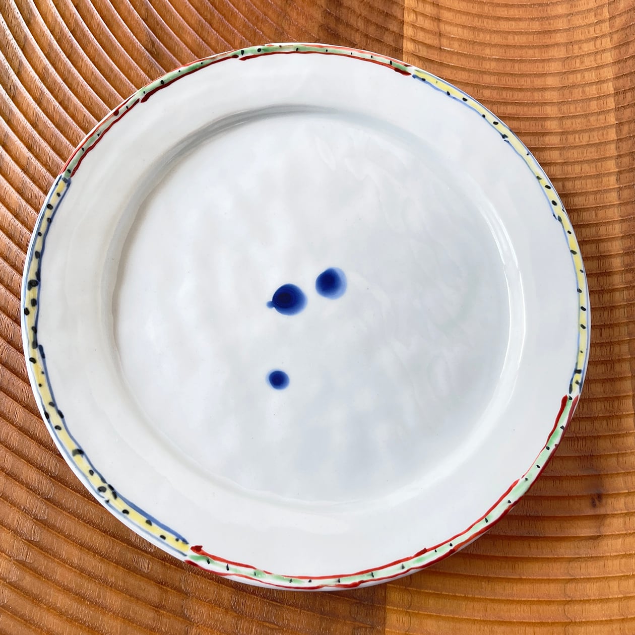 柔らかな白い磁器の地を縁取るように、華やかでモダンな色絵が施されたお皿です。赤、黄、緑、青の線が織りなす縁文様は、食卓に明るく楽しい雰囲気をもたらします。斑に配置された黒い点々が、全体にリズミカルな表情を与え、個性を際立たせています。