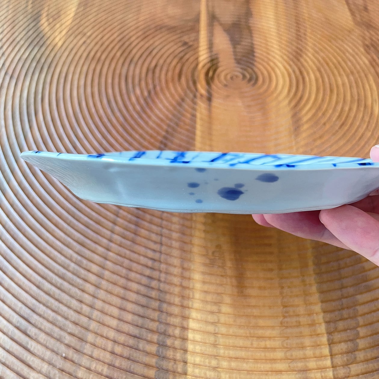 このお皿は、絵柄の美しさだけでなく、細部へのこだわりも光ります。お皿の裏面には、二か所に染付の吹き墨が加えられており、さりげない遊び心を演出しています。この特別な趣向は、手に取った人だけが楽しめる、器の奥深い表情です。