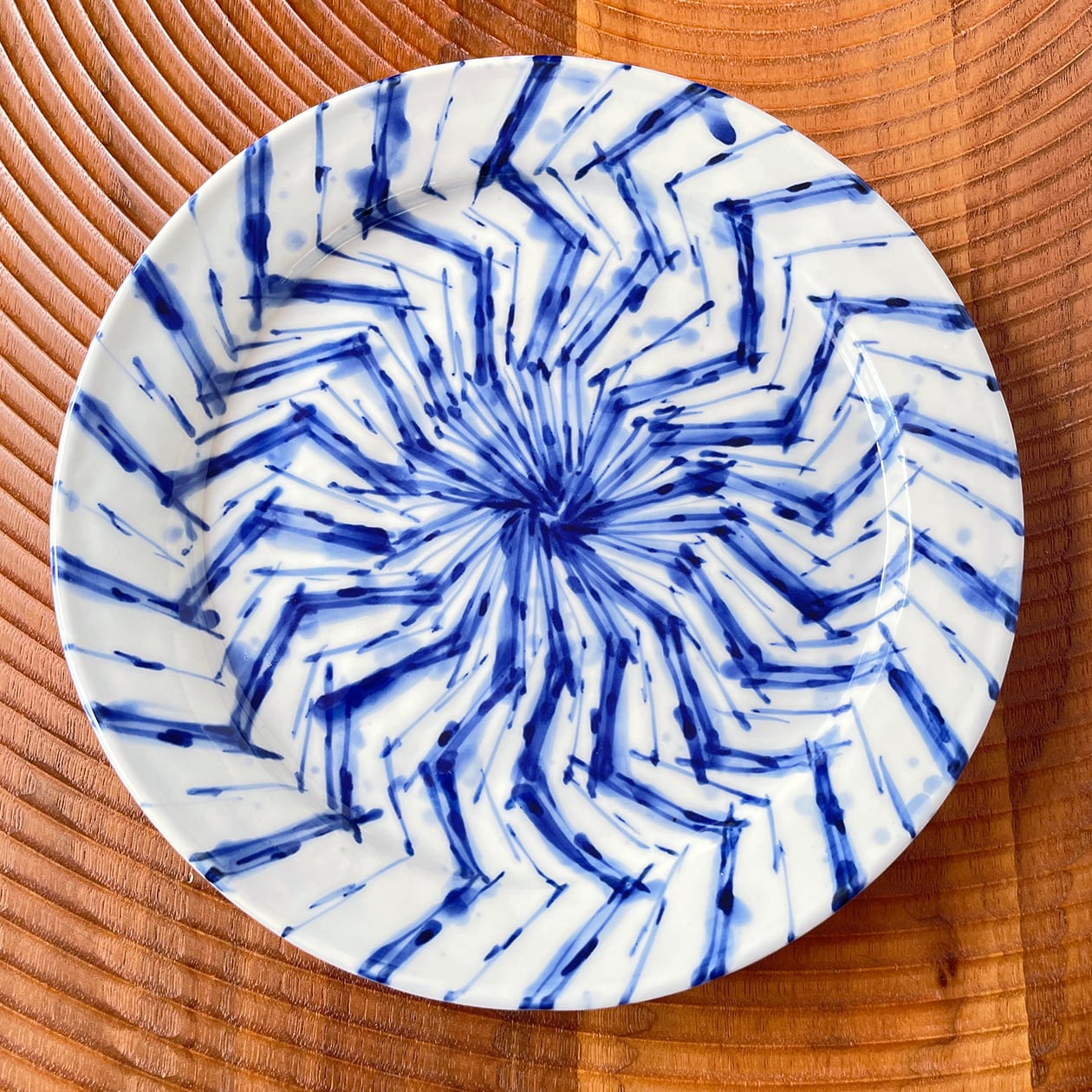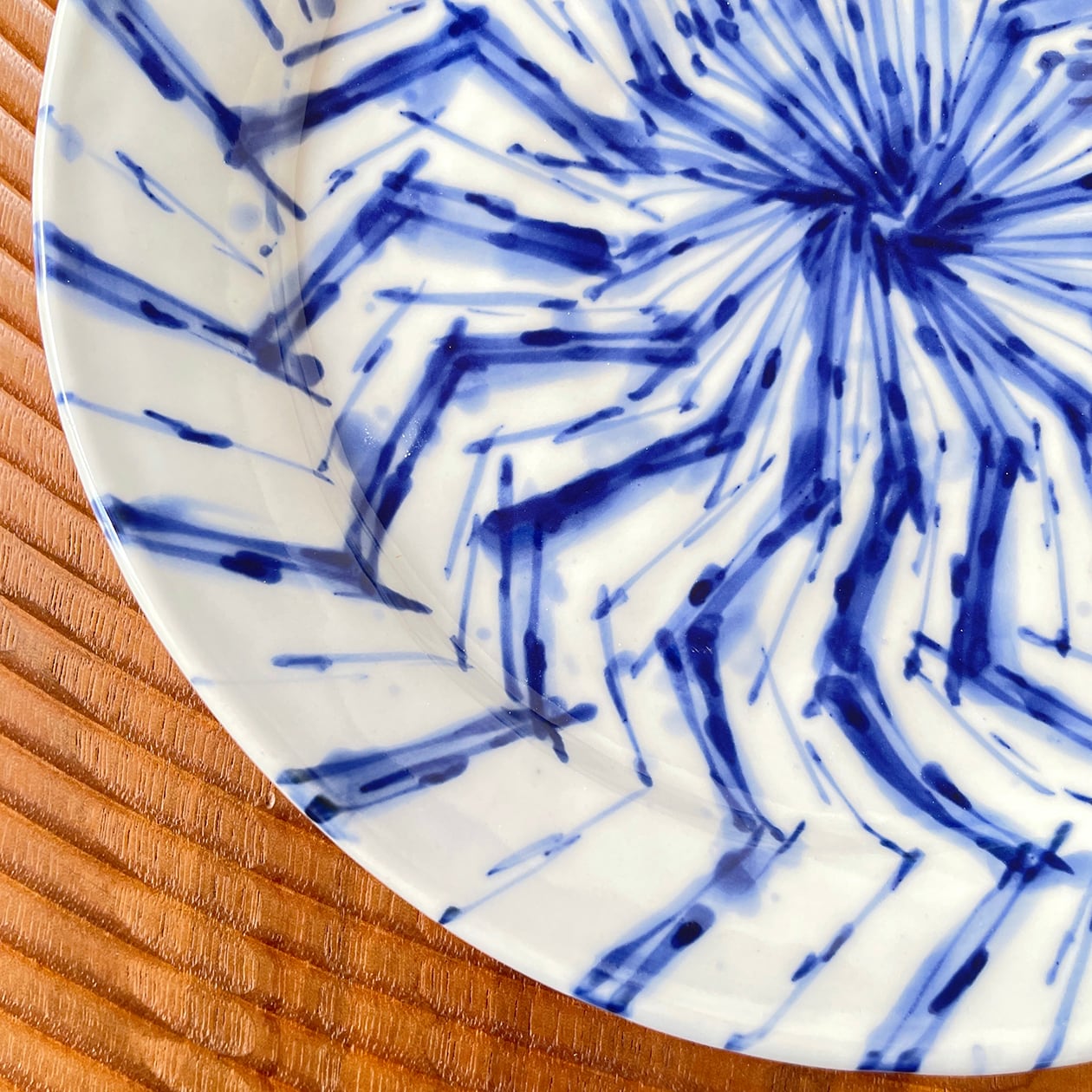 染付による大胆な渦文様が目を引く、モダンで個性的な一品です。筆の勢いを感じさせる力強い線描が、器全体に躍動的な動きを与え、食卓に洗練されたアクセントを添えます。一つひとつ手描きで描かれた渦の文様は、見込み(皿の中央)から広がるように描かれており、生き生きとした表情を生み出しています。白い磁器の地と鮮やかな呉須(ごす)のコントラストが美しく、どんな料理も鮮やかに引き立ててくれるでしょう。