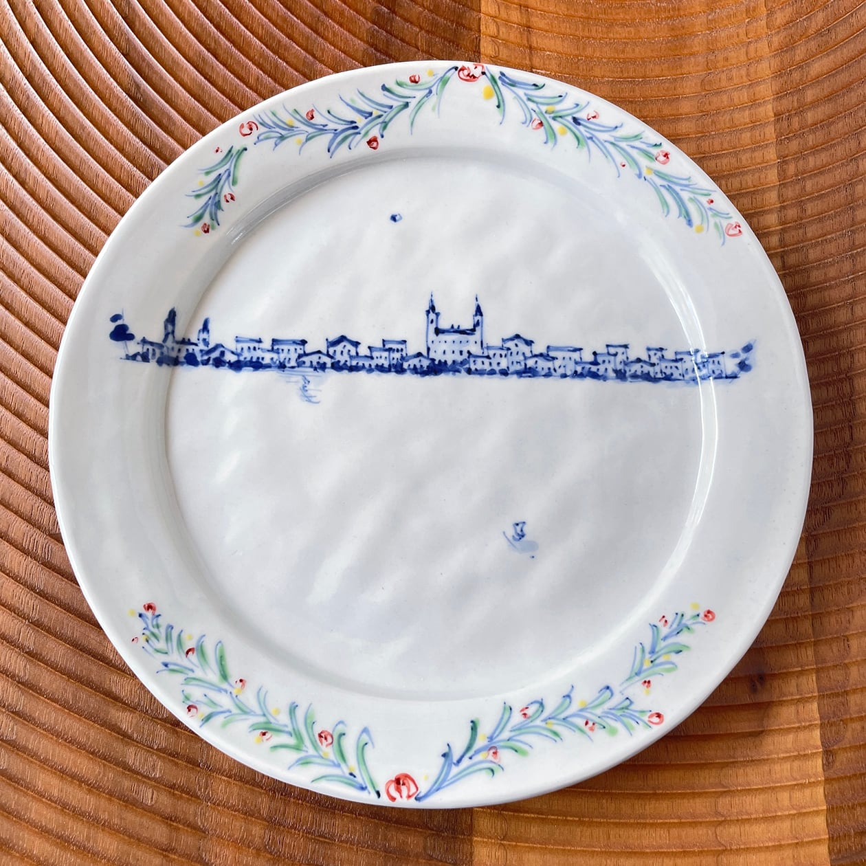 器の縁には色絵で華やかに唐草文様が描かれ、鮮やかな彩りが器を取り囲みます。そして中央部分には、染付によって湖畔の向こうに浮かび上がるヨーロッパの街並みが表現されています。藍の濃淡で繊細に描かれた街並みは幻想的な雰囲気を漂わせ、色絵の唐草と美しい対比を生み出しています。華やかさと静謐さが同居する構図は、まるで物語の一場面を映したかのようで、器そのものが一幅の絵画のような趣を持っています。