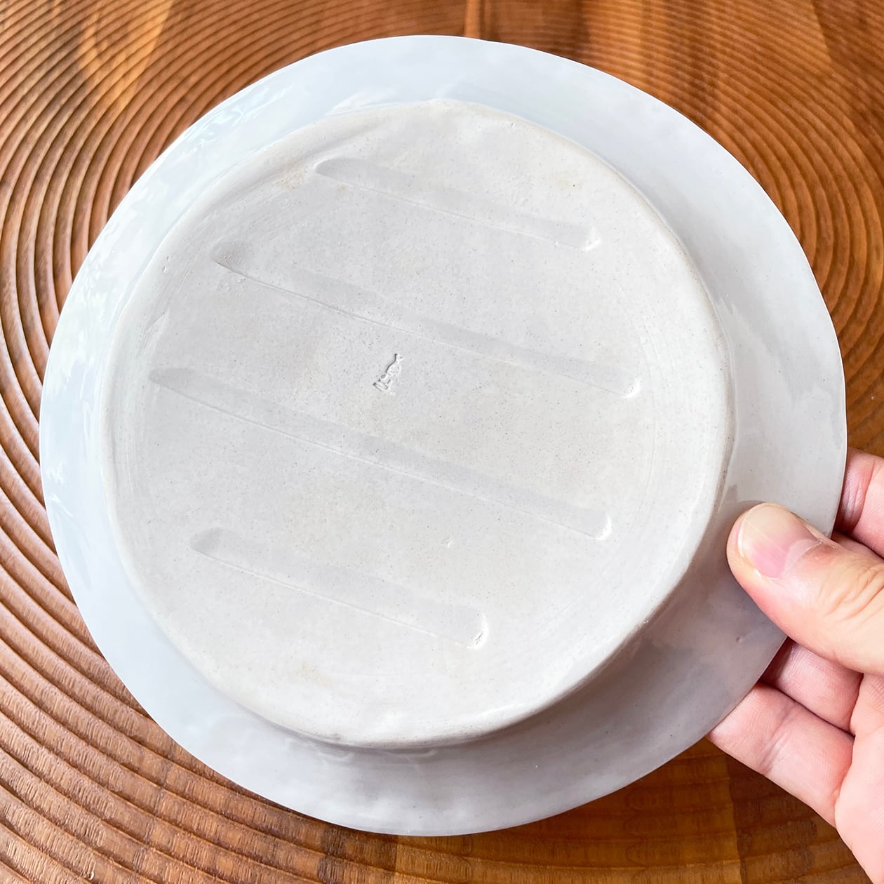サイズは直径約20cmと程よい大きさで、外側に広がるリム部分は約2.5cm。料理を盛り付ける中央のスペースは約15cmほどとなり、食パン一枚がすっきりと収まるサイズ感です。朝食にはトーストやサラダをのせて軽やかなワンプレートに、午後のティータイムにはケーキや焼き菓子を盛り付けておもてなしの器としても活躍します。ディナータイムには一人分のメインディッシュを盛り付けたり、複数人でシェアするお料理の取り皿として使ったりと、場面を選ばず使える万能さが魅力です。しっかりと設けられたリム部分は、盛り付けのバランスを取りやすく、料理を引き立てる額縁のような役割も果たしてくれます。