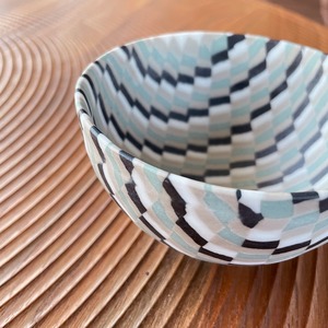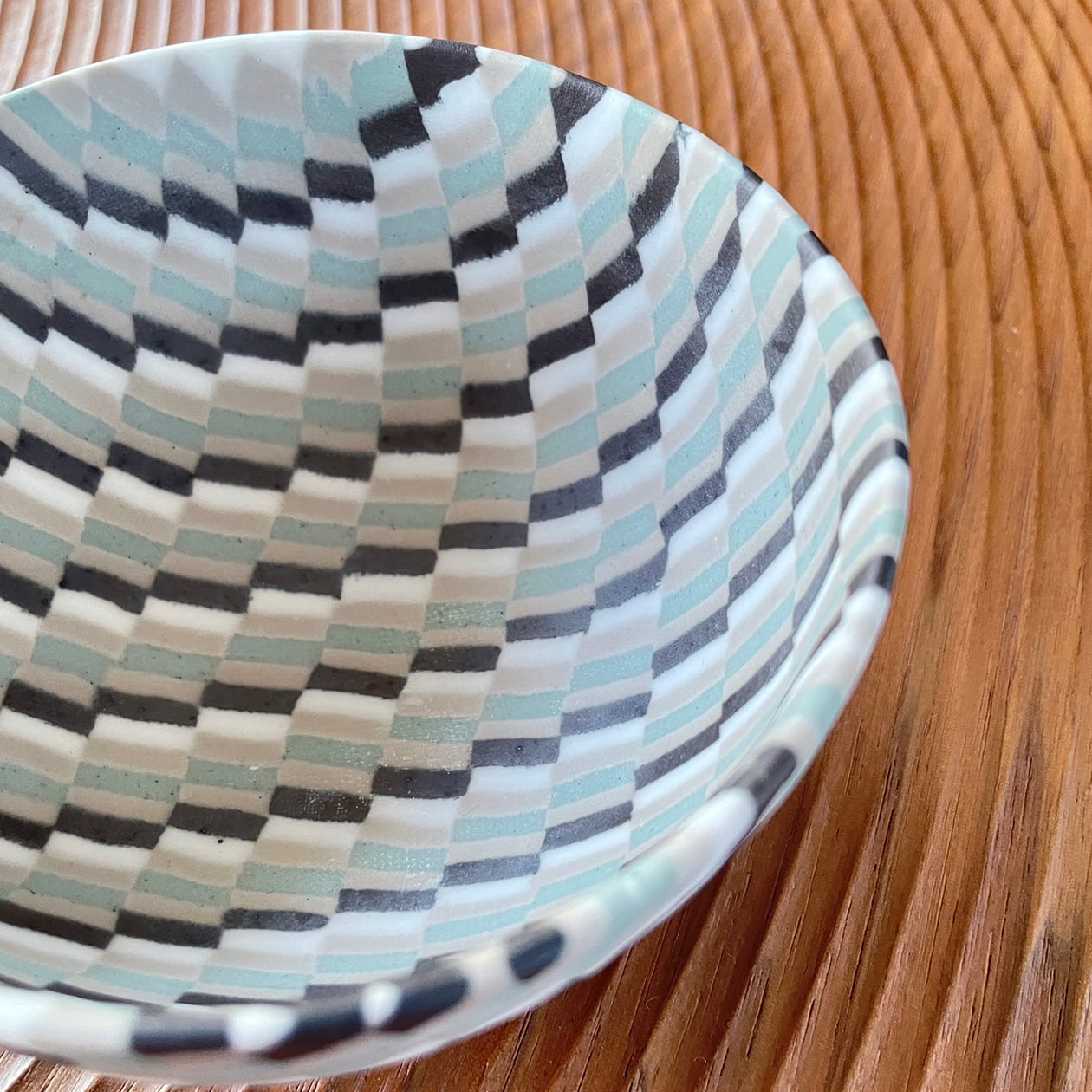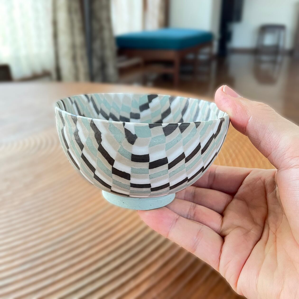 この作品の最大の特長は、艸窯ならではの練り上げ技法を用いた幾何学的な文様表現にあります。白・淡い青緑・黒が組み合わさった市松模様が、まるで織物のように立体的に浮かび上がり、器全体を包み込みます。練り上げ技法は、色土を幾層にも組み合わせ、成形の過程で模様そのものを土に刻んでいくため、器の内外にわたり自然な連続性をもって柄が広がります。筆や釉薬による絵付けでは表現できない、土の質感と模様の一体感が感じられるのは、この技法ならではの魅力です。