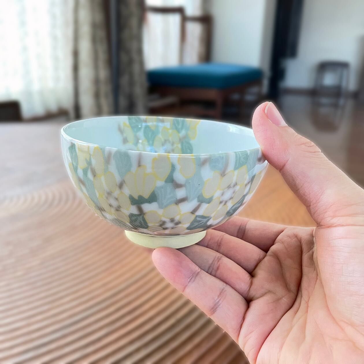 ご飯茶碗としてはもちろん、軽い丼やお茶漬け、小鉢としても幅広く活躍します。ひとつひとつ手作業で仕上げられているため、花びらや葉の模様の出方、色の濃淡には個体差があり、それぞれが世界にただ一つの景色を持っています。まさに手仕事の器ならではの魅力です。