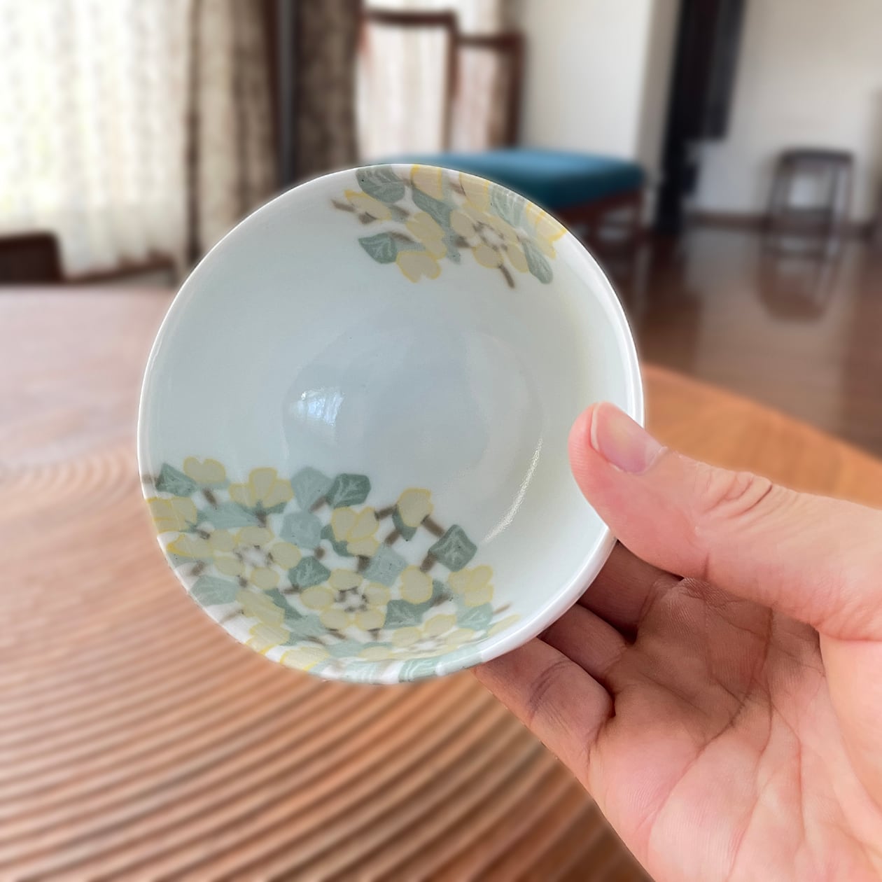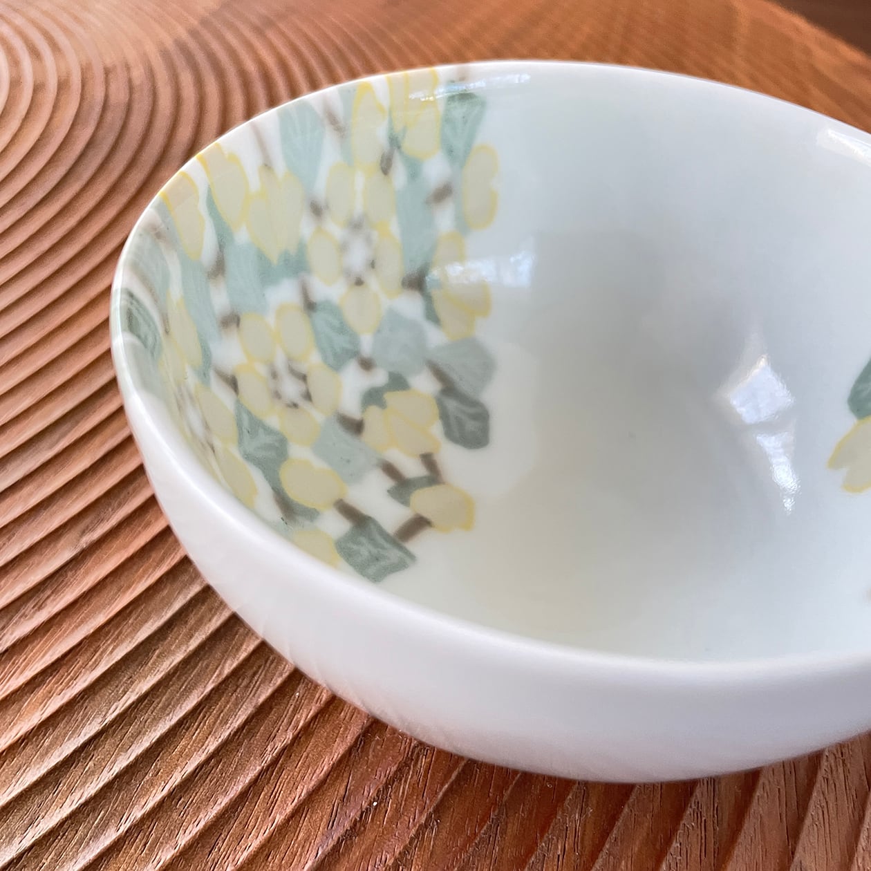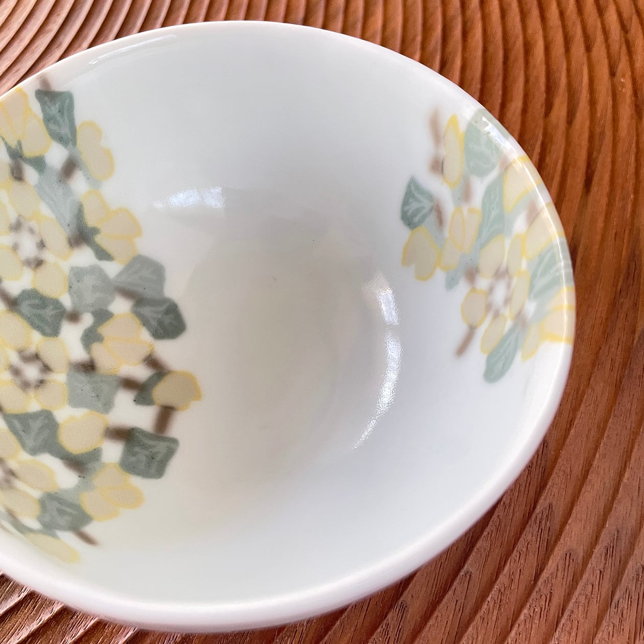 葉の部分は濃淡の異なる二色の緑を組み合わせ、自然な奥行きとみずみずしさを表現。模様が器の内外に一体となって広がることで、まるで土そのものが山吹の花へと姿を変えたかのような独特の景色を見せてくれます。淡い黄色と緑が織りなす色彩は、春から初夏のやわらかな光を思わせ、食卓に清涼感と華やぎを添えてくれます。