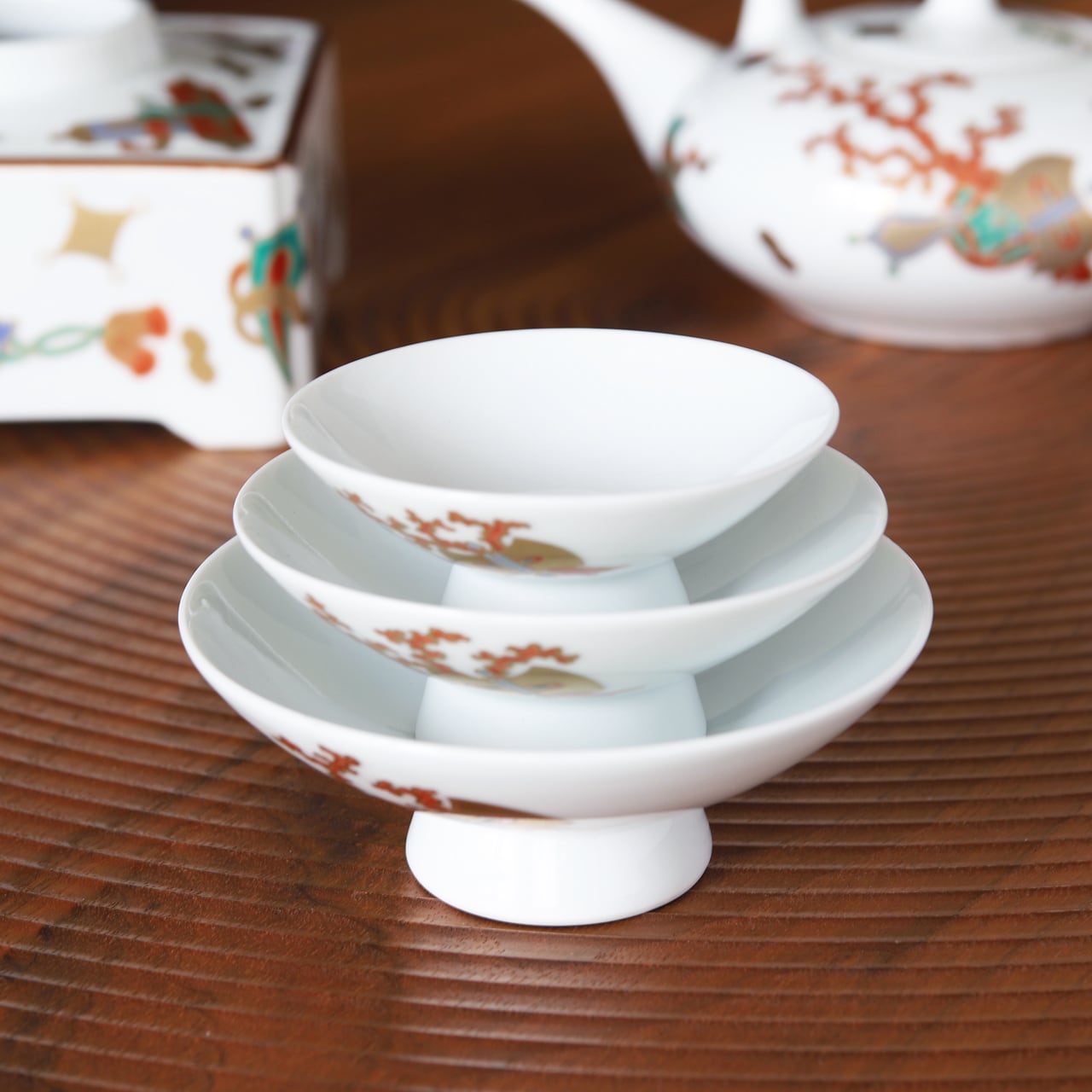 注器・盃3客・盃台のセットには、打ち出の小槌、宝袋、巻物、分銅、軍配など、幸福・豊穣・繁栄を象徴する“宝尽くし”が色絵で描かれています。赤・緑・金を中心とした古典的な色遣いは、有田焼の伝統をしっかり受け継ぎながらも、現代の食卓にも柔らかく馴染む優しい印象に仕上がっています。品よく配置された文様はどこから眺めても美しく、祝道具としてはもちろん、飾っておくだけでも空間に華やぎを添えてくれます。