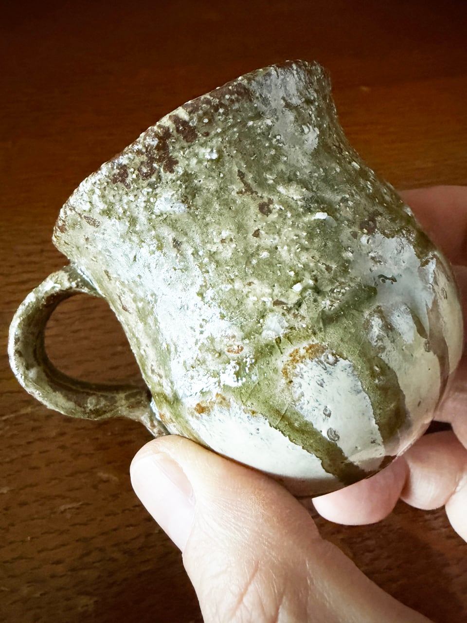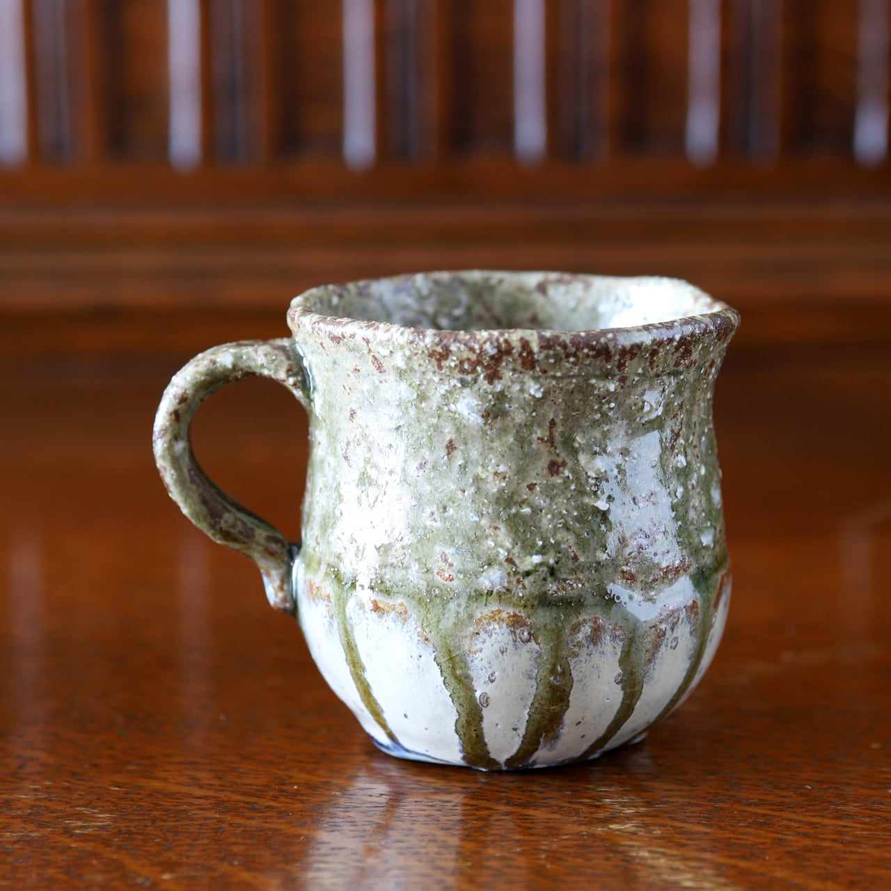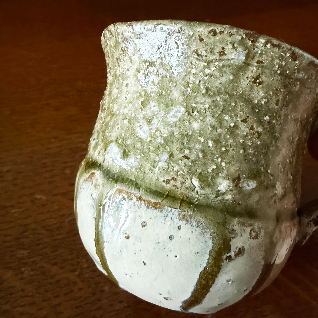 素朴さと力強さを兼ね備えた迫能さんの作風がよく表れた一品で、信楽の土ならではの荒々しい質感と、灰釉と白釉の掛け分けが生み出す自然な景色がとても美しいマグカップです。釉薬が流れ落ちる表情や、窯変で生まれる奥行きある色合いは、まさに手仕事ならでは。見れば見るほど味わいが深まり、使い手の心をほどよくくすぐります。