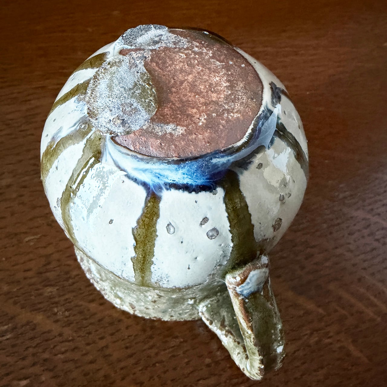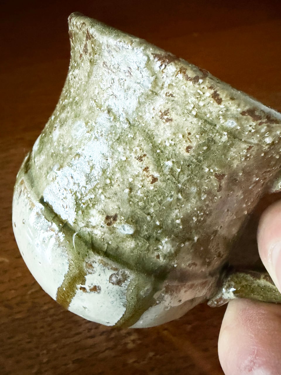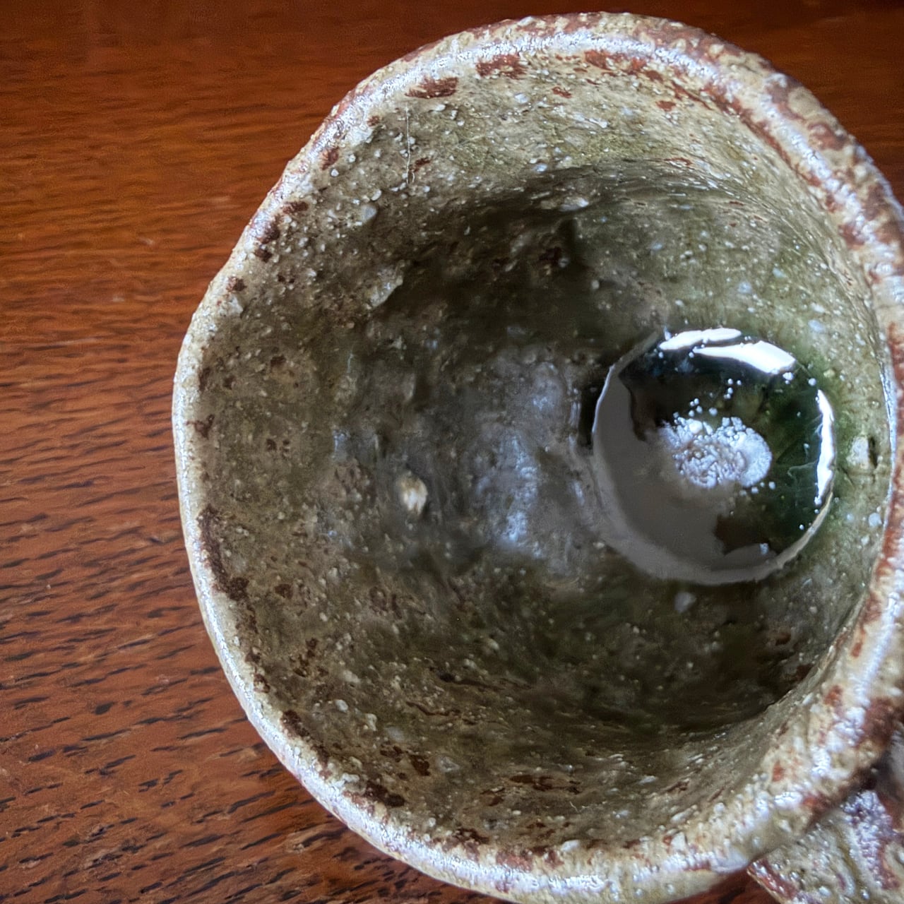 素朴さと力強さを兼ね備えた迫能さんの作風がよく表れた一品で、信楽の土ならではの荒々しい質感と、灰釉と白釉の掛け分けが生み出す自然な景色がとても美しいマグカップです。釉薬が流れ落ちる表情や、窯変で生まれる奥行きある色合いは、まさに手仕事ならでは。見れば見るほど味わいが深まり、使い手の心をほどよくくすぐります。