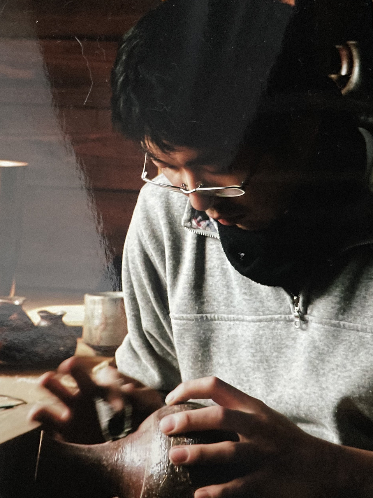 森岡さんの器づくりの中心となるのが、古くから伝わる 蹴ロクロ の技法。足でロクロを蹴って回転を生み出すこの手法は、電動ロクロとは異なり、作り手の呼吸やリズムがそのまま器の表情として現れます。森岡さんはこの蹴ロクロにこだわり、土に触れる瞬間の感覚や、自分の身体の動きと一体となるような制作を大切にしています。