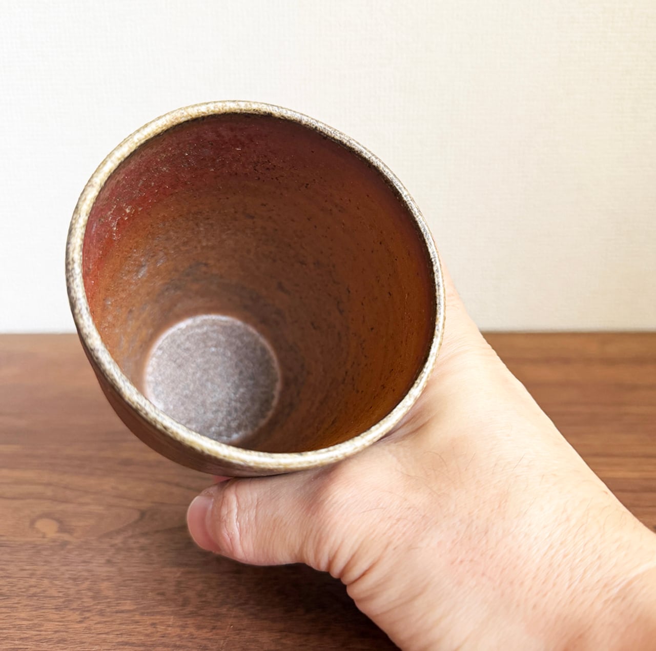 持ち手のないすっきりとした形のこのカップは、焼締ならではの渋く落ち着いた風合いが魅力。釉薬を使わず高温で焼き締めることで、土の質感がそのまま表れ、ひとつひとつ異なる景色を楽しむことができます。ろくろ目や火の当たり具合、灰の影響による色の変化など、自然の力がつくり出す表情は、使うほどに愛着が深まります。