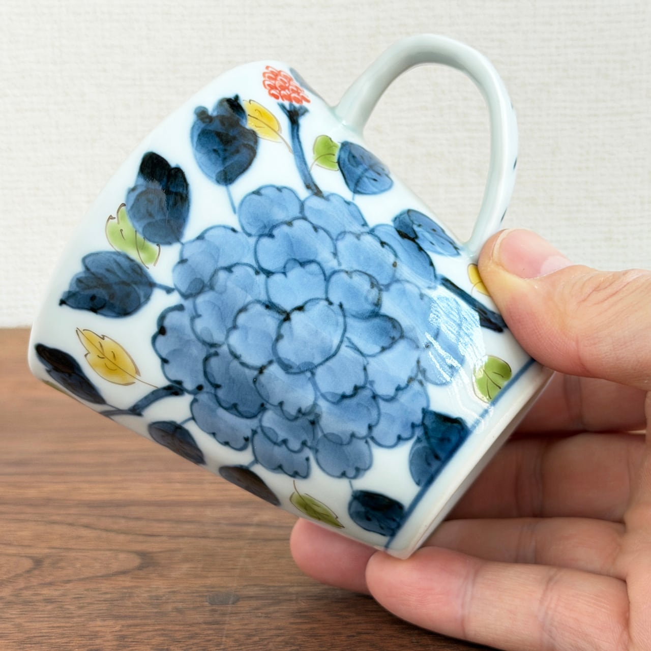 堂々と咲き誇る牡丹を、染付と色絵で表現した「染錦牡丹 マグカップ(小)」。
