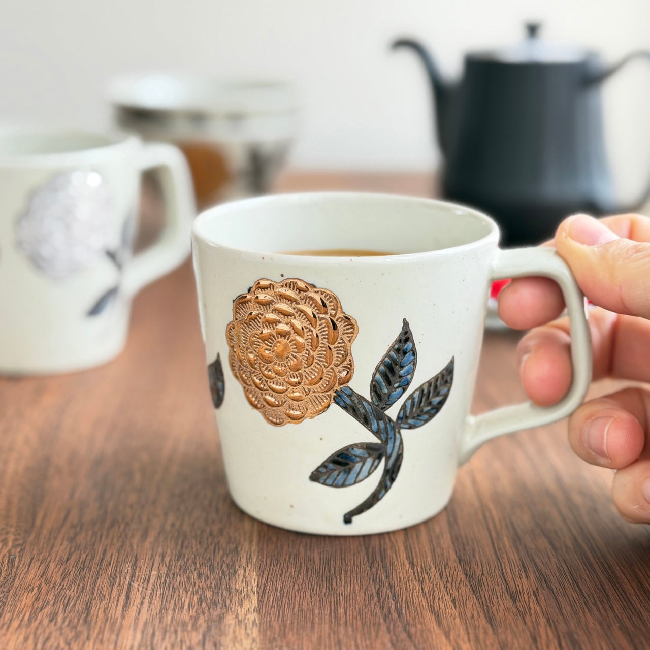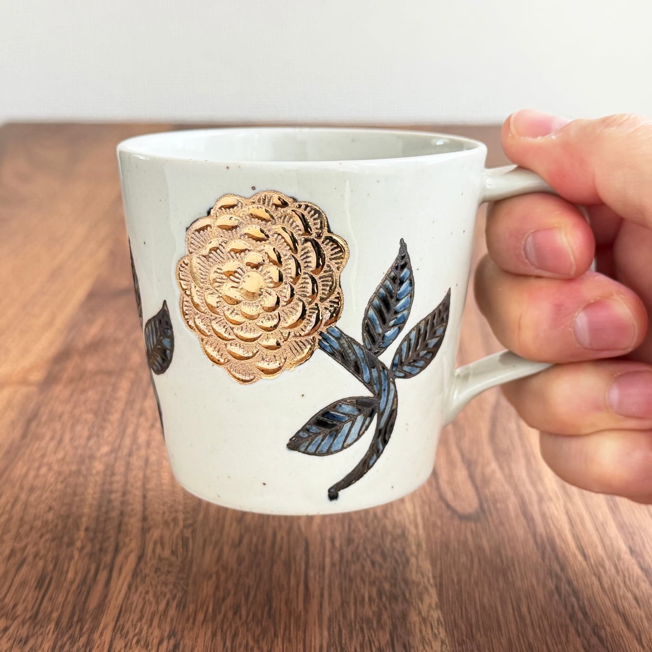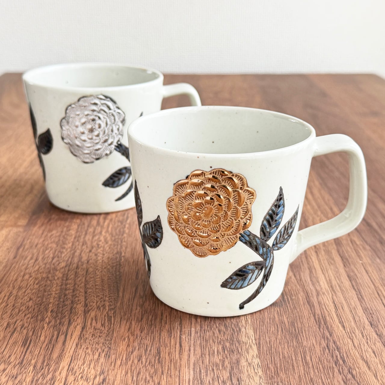 波佐見焼の窯元・菊祥陶器が手がけた「濃ダリア マグカップ(金・銀)」は、日常のひとときを上品に彩るマグカップです。
