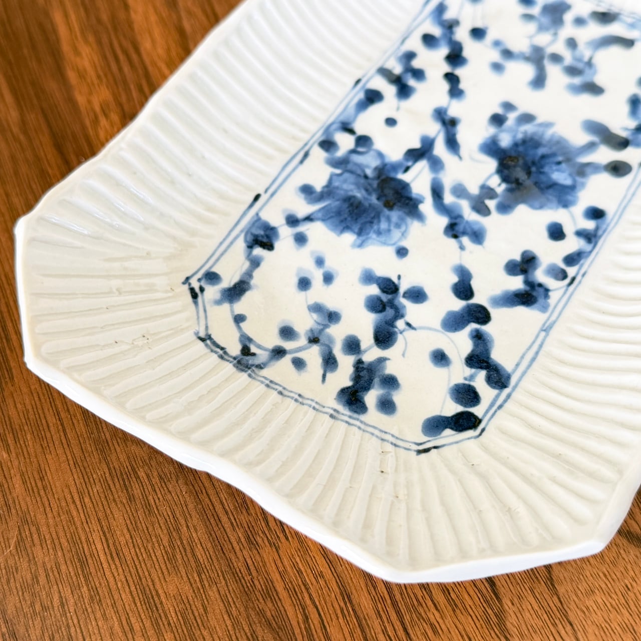 見込み部分には、染付による絵柄がのびやかに描かれています。濃淡を活かした筆致で表現された文様は、にじみやかすれを残しながら広がり、余白を活かした構成によって軽やかな印象を与えます。絵柄は中央に寄せすぎず、長角の形に沿うよう配置されているため、盛り付けた料理の邪魔をせず、器全体のバランスを美しく保ちます。料理をのせたときには、絵柄がさりげない背景となり、食材の色合いを引き立ててくれます。
