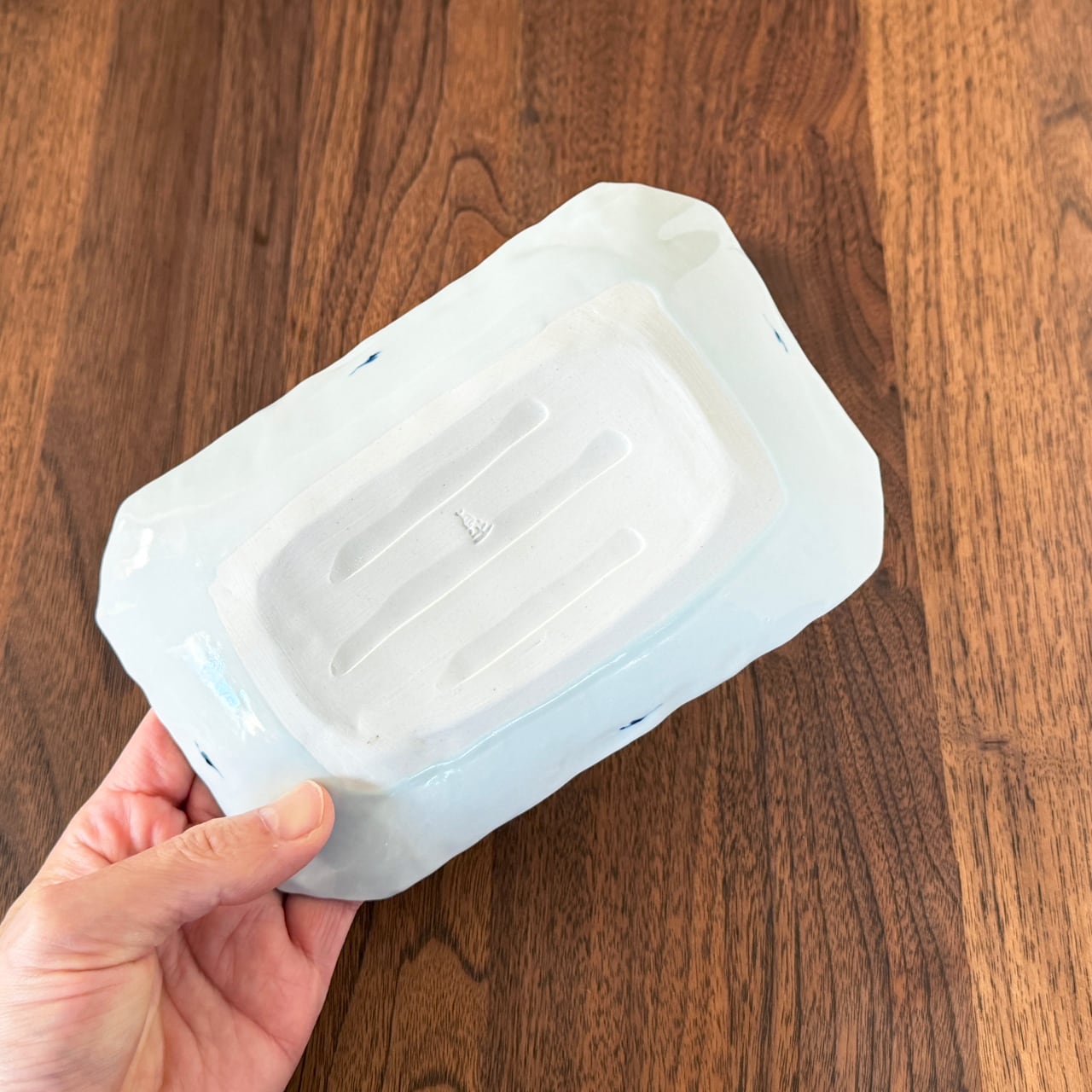 絵柄は藍一色の染付でまとめられ、縁には勢いのある筆致が巡らされています。しのぎの凹凸と重なり合うことで、染付に自然な動きと奥行きが生まれ、器全体に引き締まった印象を与えています。中央には円形に構成された文様が描かれ、長角の形の中に視線の拠り所をつくり、全体のバランスを整えています。抽象的でありながらもどこか和の趣を感じさせる意匠は、料理のジャンルを選ばず、盛り付けた料理を引き立てます。
