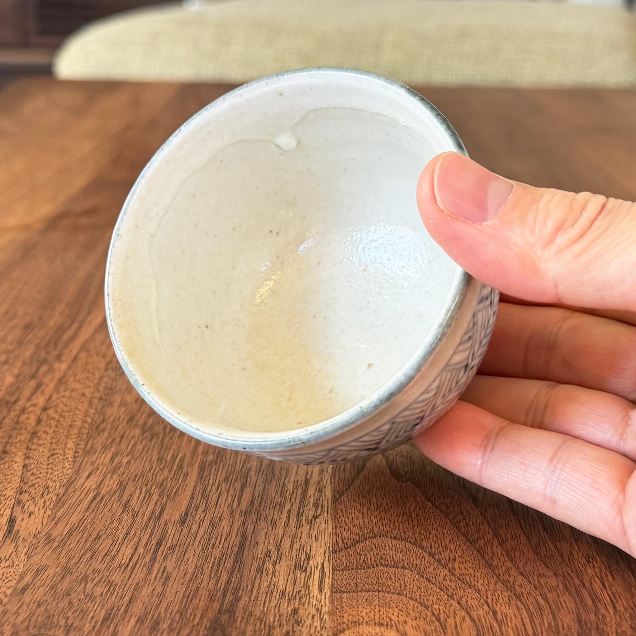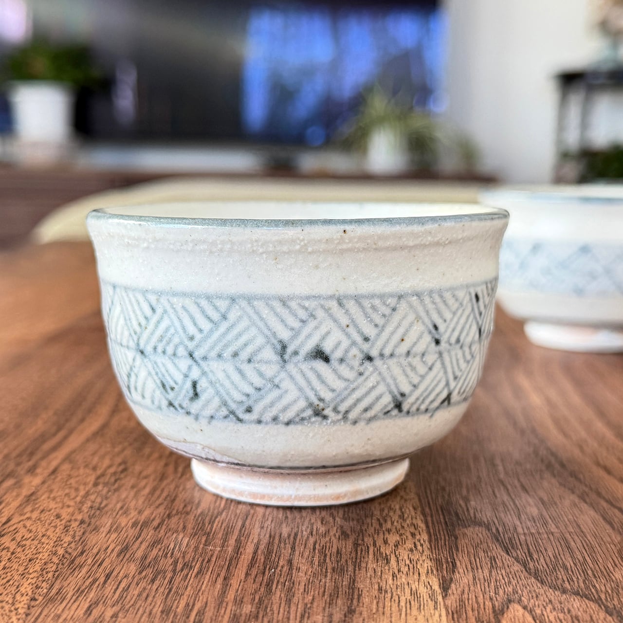 染付による幾何学的な文様は、規則性の中にわずかな揺らぎが感じられ、手仕事ならではの温もりを伝えてくれます。磁器でありながら、釉薬の濃淡や焼成の表情によって、どこか土物のような柔らかさと奥行きを感じさせる点も、この器ならではの魅力です。