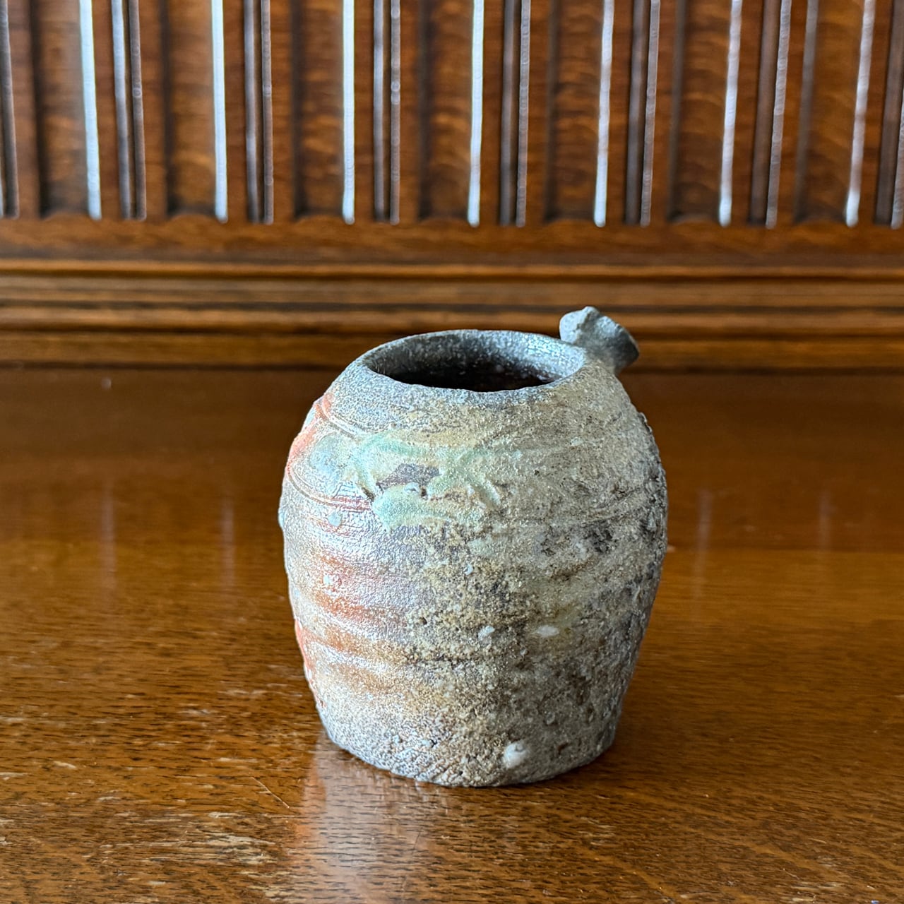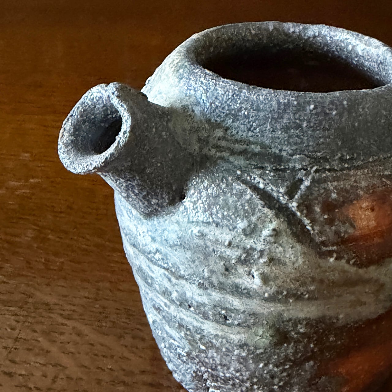 表面には信楽土ならではの粒子感があり、ざらりとした荒々しさの中に、ところどころガラス質となった自然釉の艶が見られます。マットな質感と艶やかな部分との対比が、この片口に独特のリズムと緊張感を与えています。手に取ると、土物ならではの力強さと温もりが、じんわりと伝わってきます。