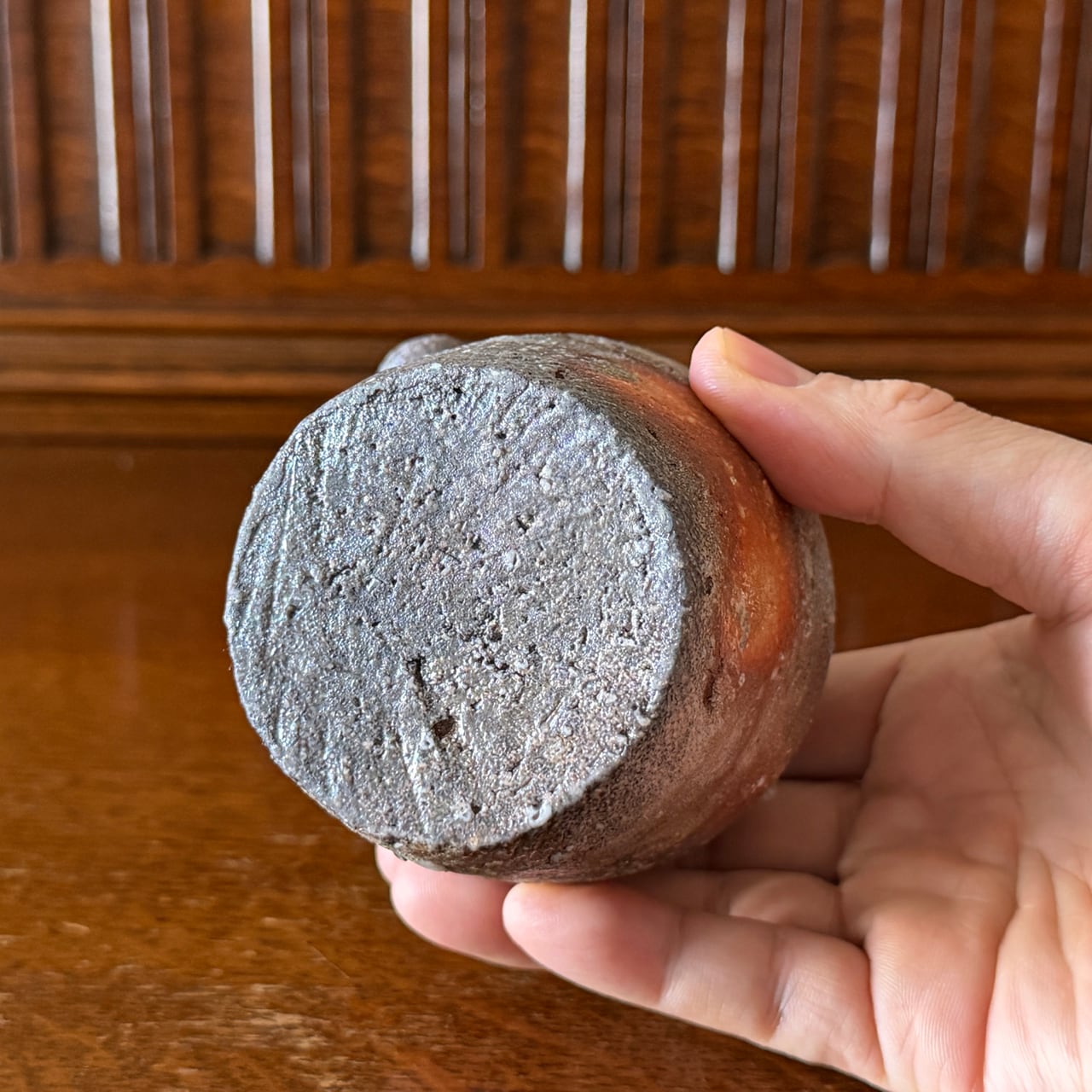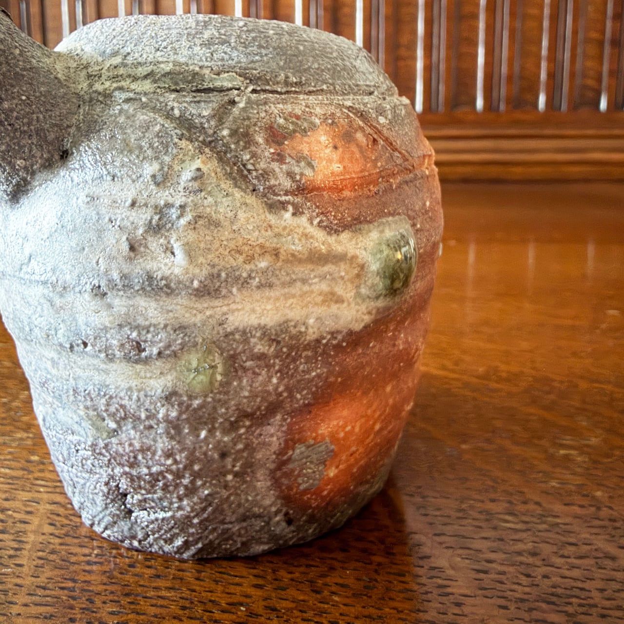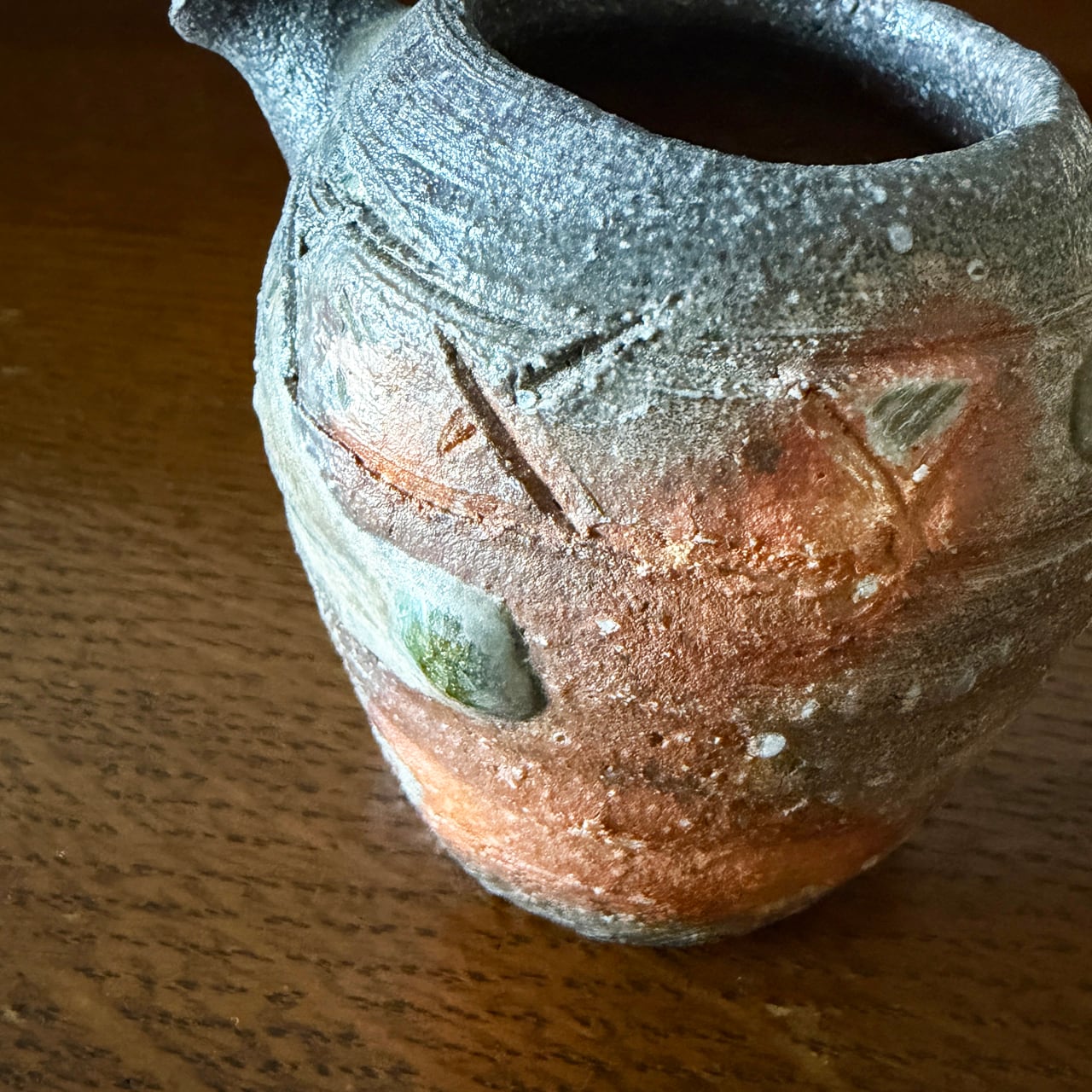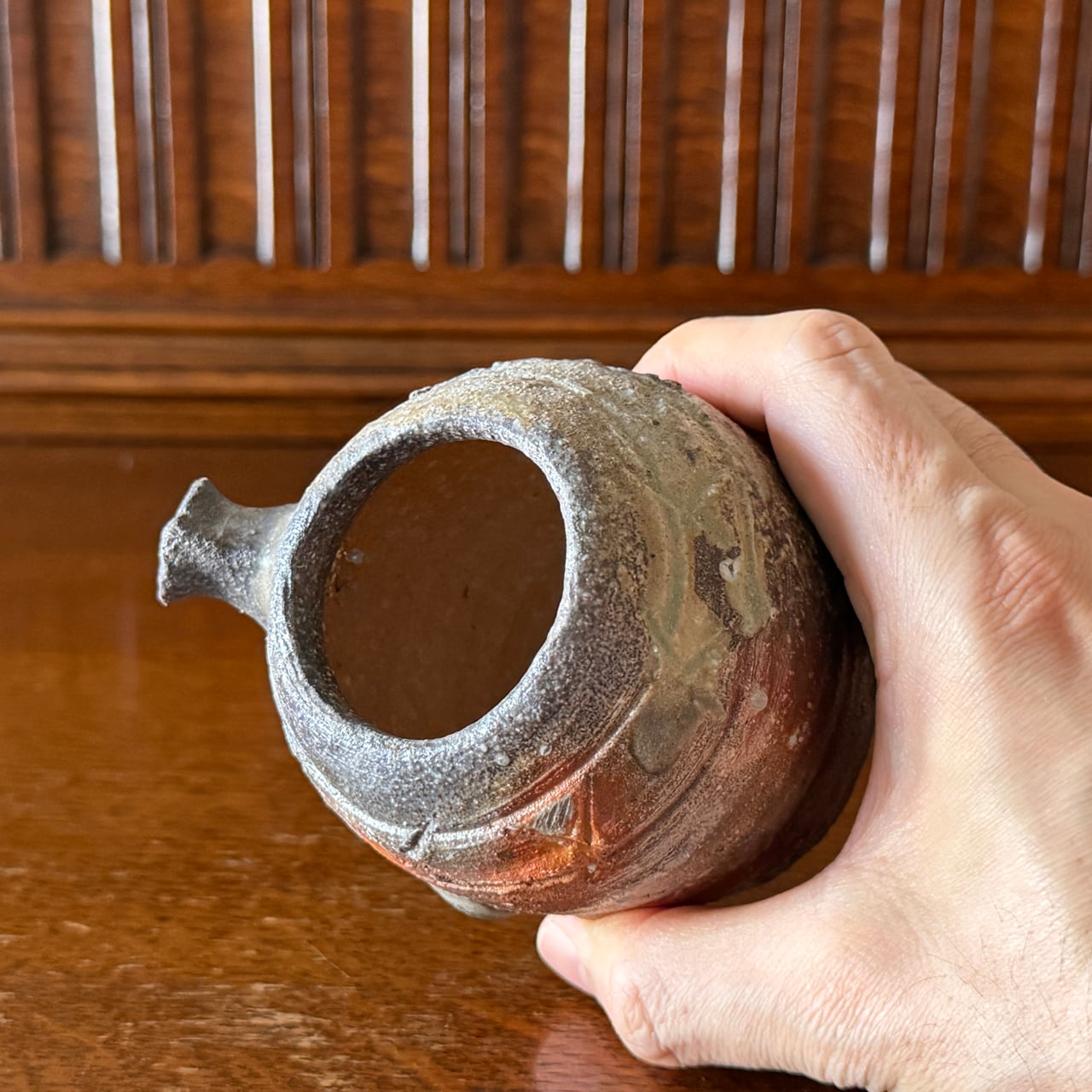 正面には信楽らしい赤味を帯びた土色が残り、それ以外の部分は、ほぼすべて炎に焼かれることで色が変化しています。灰が降りかかり、溶け、流れ、焼き締まり、青灰色から淡い緑味、そして黒味を帯びた部分まで、複雑で奥行きのある景色が器全体に広がっています。その一つひとつが偶然の産物であり、二つとして同じ表情のない、まさに一期一会の器です。