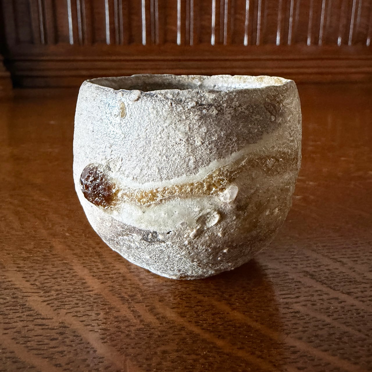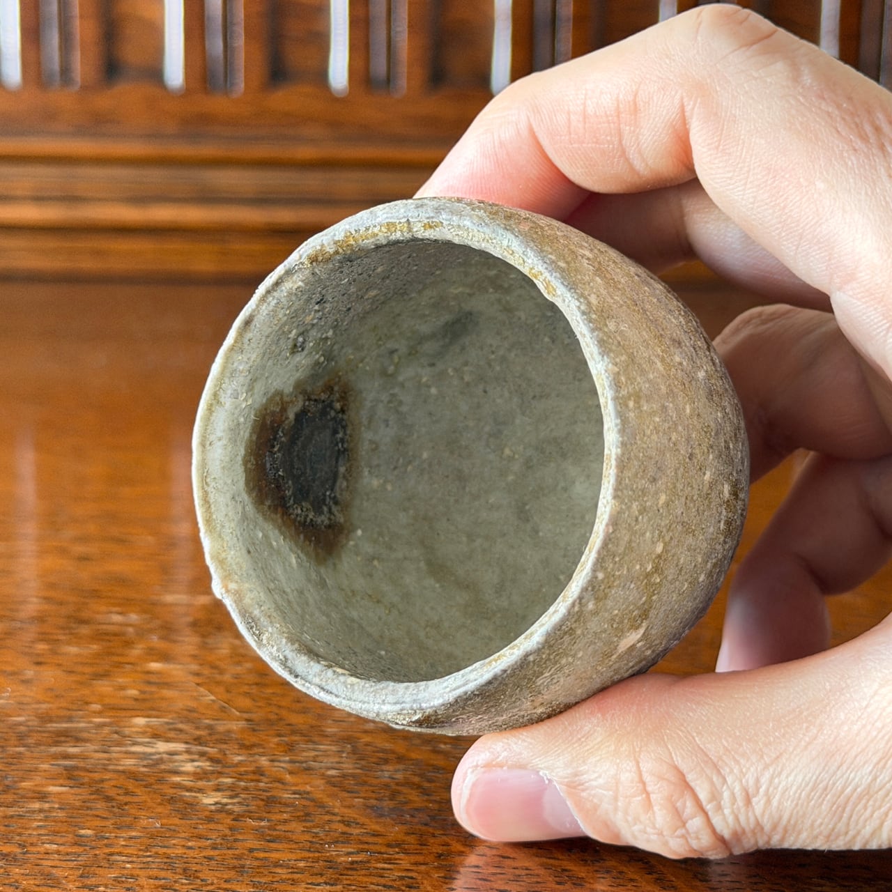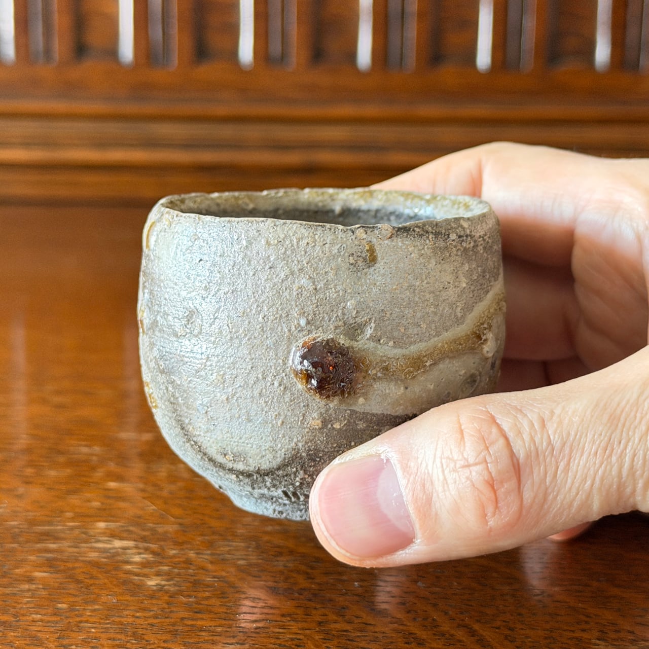 表面には信楽土ならではの粒子感があり、ざらりとした荒々しさの中に、ところどころガラス質となった自然釉の艶が混じり合っています。マットな炭化の質感と、艶やかな釉溜まりとの対比が、このぐい吞みに独特の緊張感と奥行きを与えています。手に取ると、土物らしい重みとともに、しっとりとした安定感が伝わってきます。