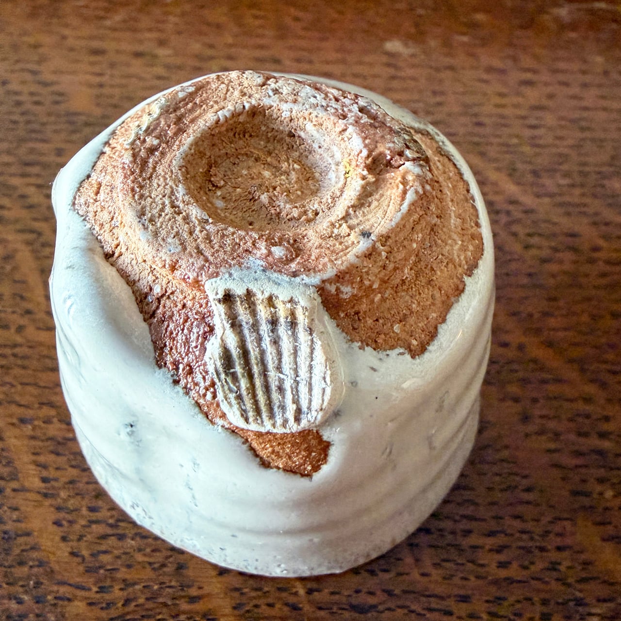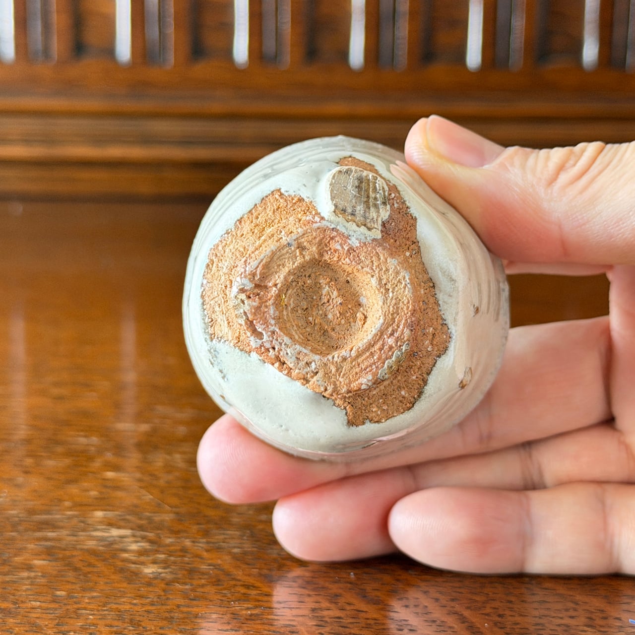 下部には一か所だけ貝殻の跡が残されており、主張しすぎないさりげなさが、この器ならではの魅力となっています。炎と灰、土と釉薬が偶然に生み出した、まさに“自然の景色”を閉じ込めたような一客です。