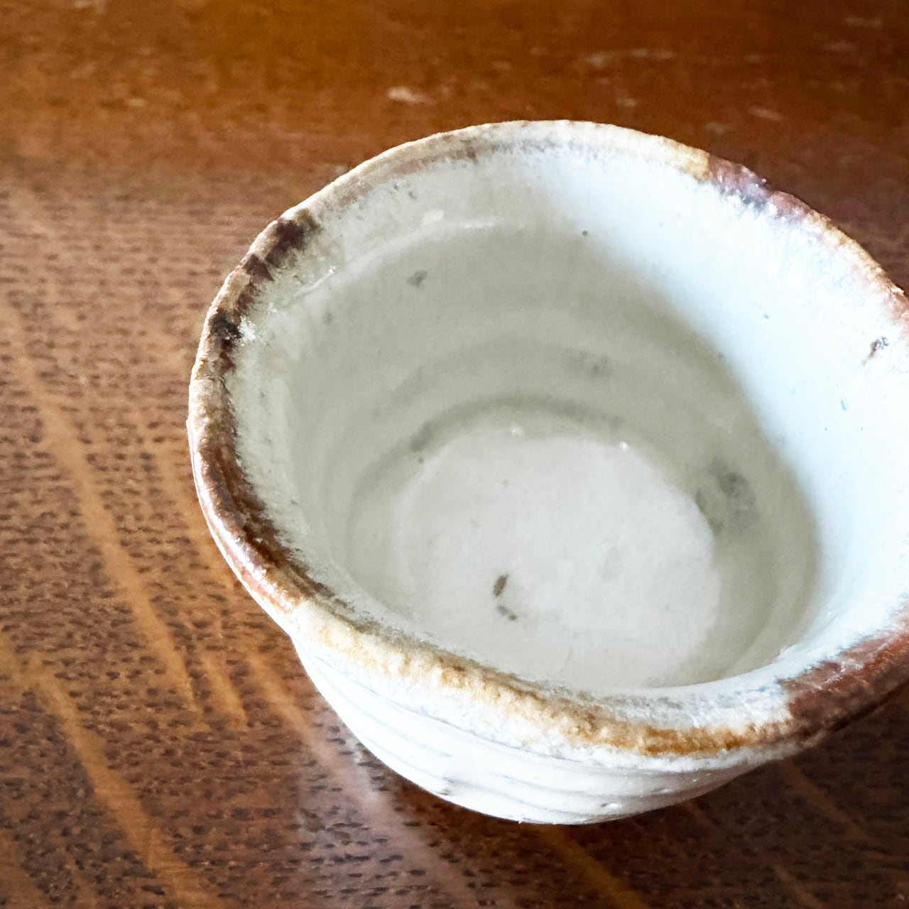 口縁部には黒く発色した窯変が現れ、白釉のやわらかな表情を引き締めるアクセントに。内側にもほんのりと景色が入り、酒を注いだときの見え方にも奥行きがあります。