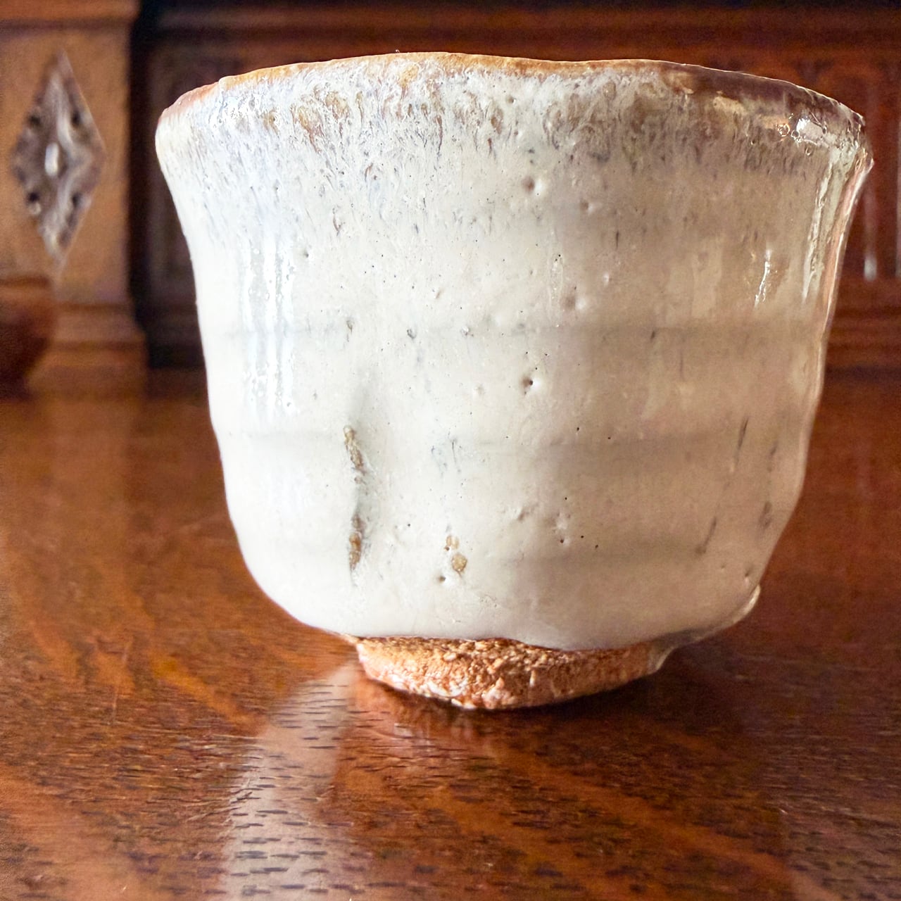ロクロ成形のあとが横方向にやさしく残り、さらに縦に削りを入れることで、まるで模様のようなリズムある景色が生まれています。その凹凸に沿うように白釉が溜まり、淡い白から乳白色、ところどころに現れる素地の色味まで、自然な濃淡の変化が楽しめます。