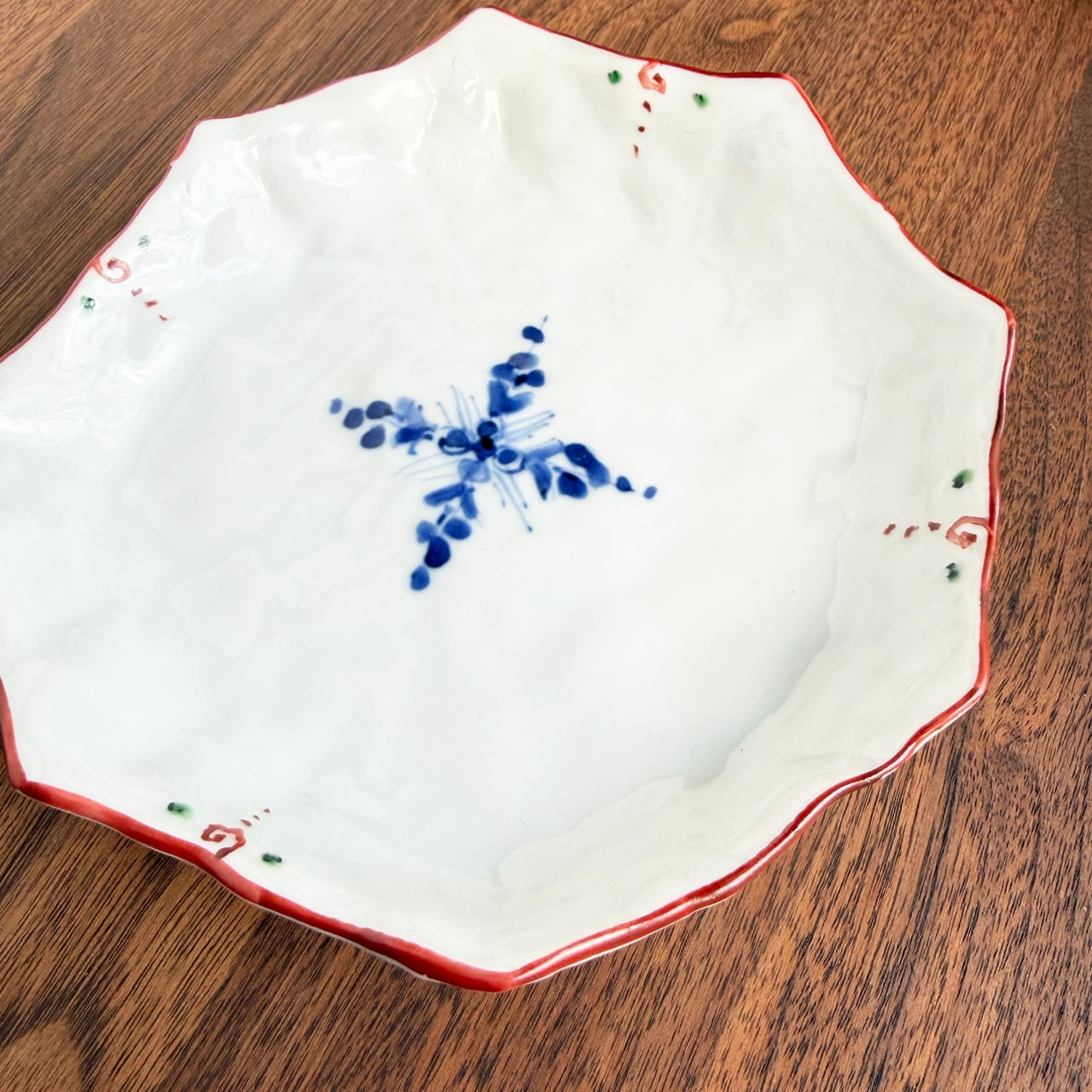「 八角取り皿 約15cm|染付十字文×赤絵 」
