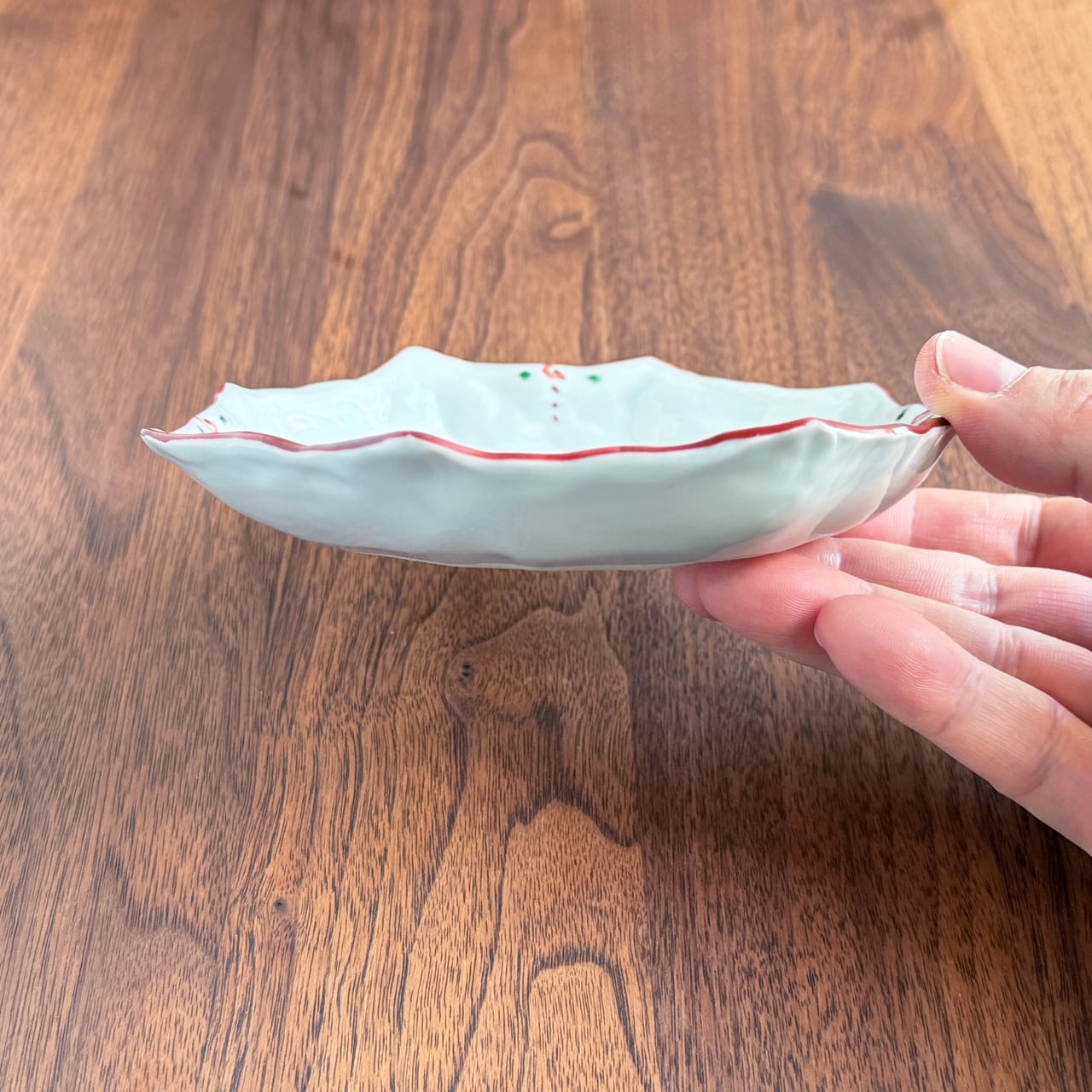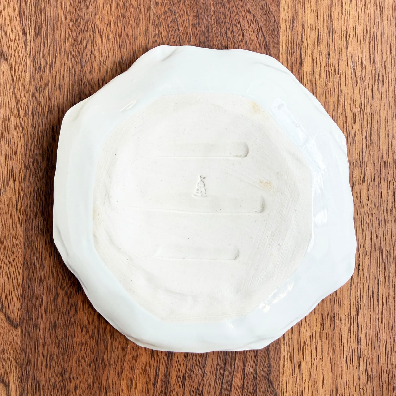 白磁のやわらかな肌合いを活かし、中央には染付による十字文様、縁には赤絵と小さな色点がリズムよく配された一枚です。静けさの中に遊び心があり、見るたびに表情の変化を楽しめる、松尾さんらしい絵付けが魅力です。