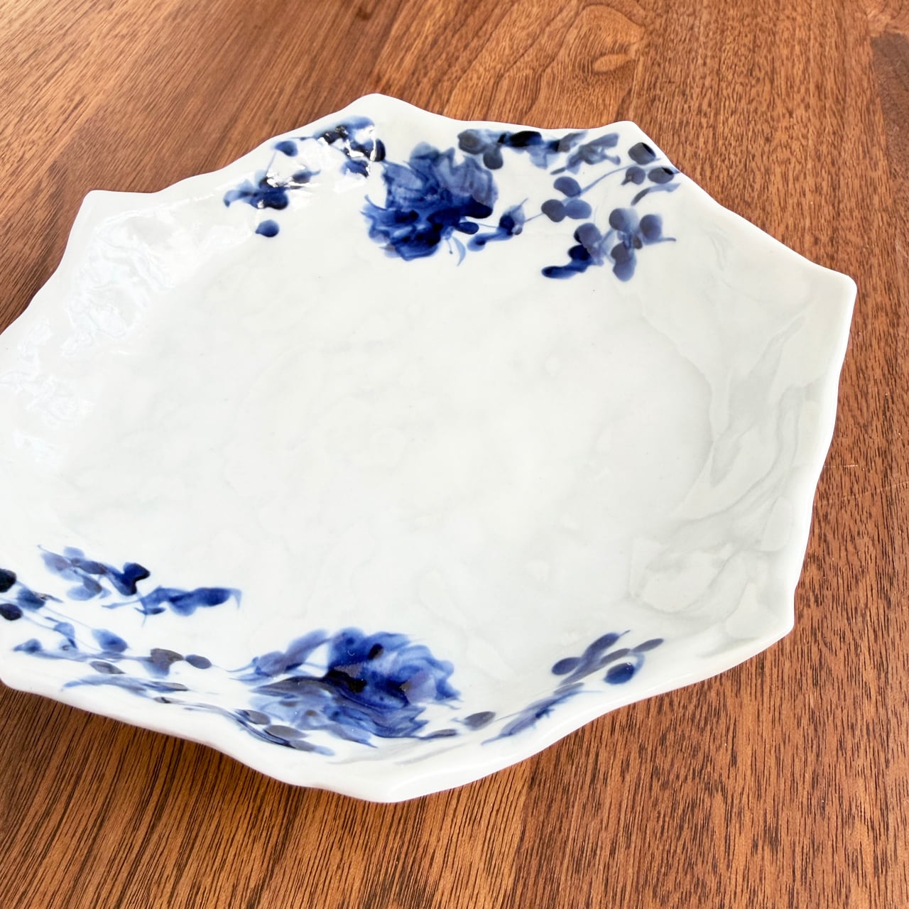 白磁の余白を大きく取り、縁に沿って染付の唐草文が配された、のびやかで表情豊かな一枚です。濃淡のある青がにじむように重なり合い、唐草の気配が器のまわりをやさしく巡る、松尾さんらしい軽やかな絵付けが魅力です。