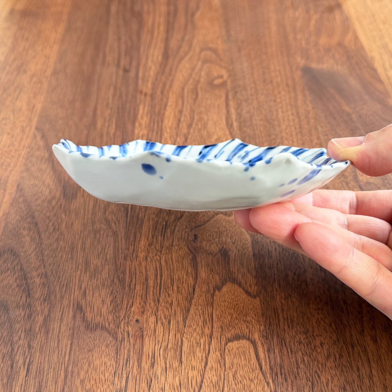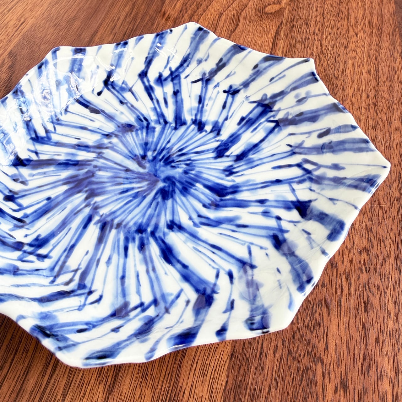 器の中心から放射状に伸びる染付の筆致が全面に描かれた、躍動感あふれる一枚です。一本一本の線には濃淡やかすれがあり、勢いの中にも手仕事ならではの表情が感じられます。盛り付けた料理を包み込むように受け止め、器そのものが食卓の主役になる存在感です。