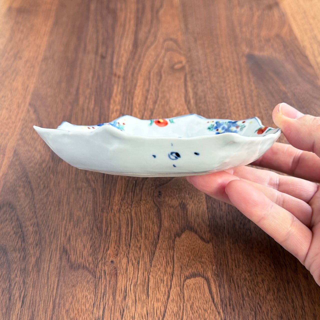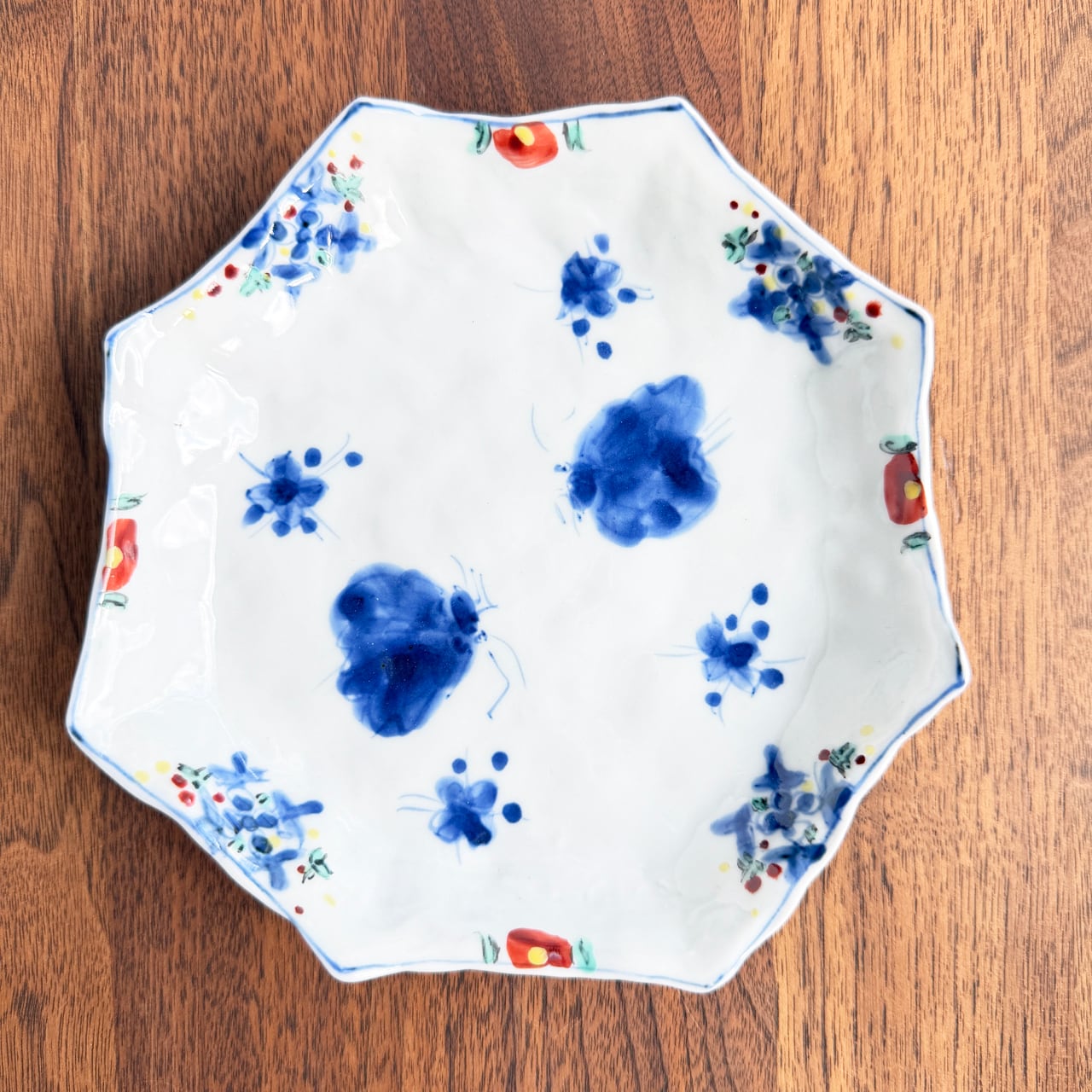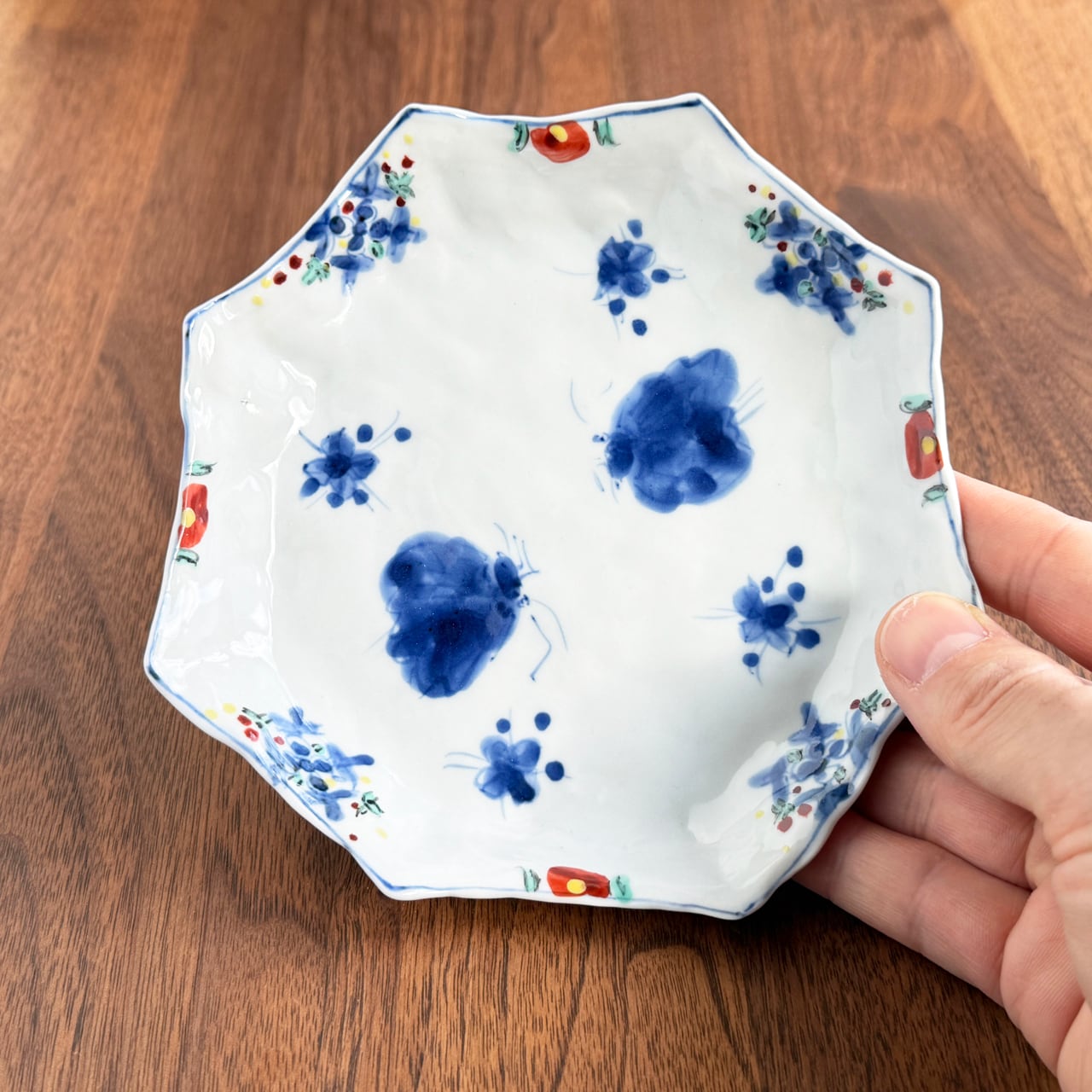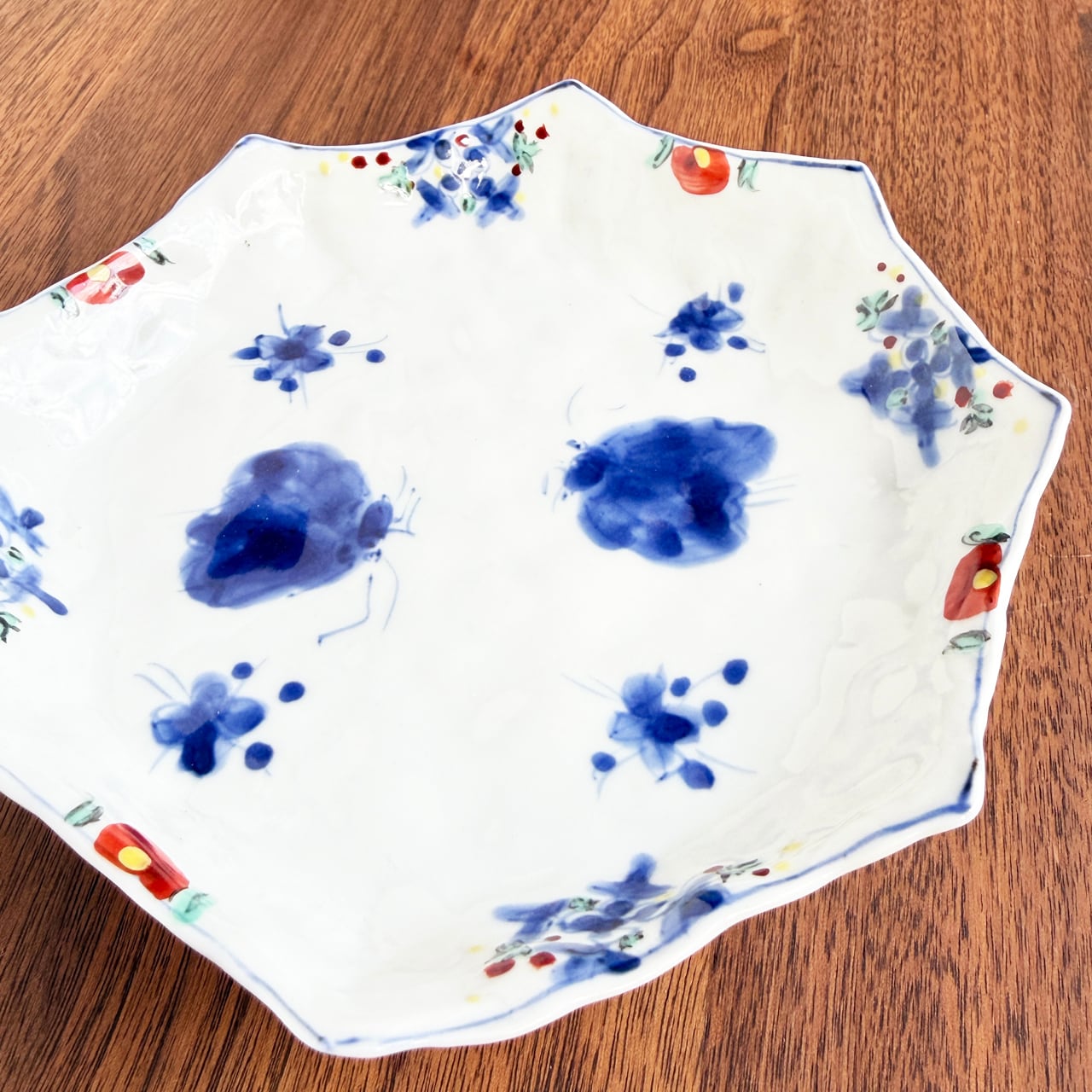 にじみを含んだ染付の青と、やわらかな色絵の組み合わせが美しく、華やかさの中にも品のある佇まいが感じられます。