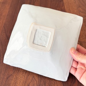 白磁のやわらかな余白の中に、中央に描かれた染付の文様が印象的な6寸角鉢です。