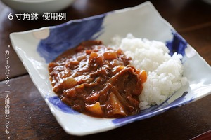 6寸角鉢は、煮物やお造り、前菜などを美しく盛り付けるのにちょうどよい大きさで、日々の食卓からおもてなしの場まで幅広く活躍します。