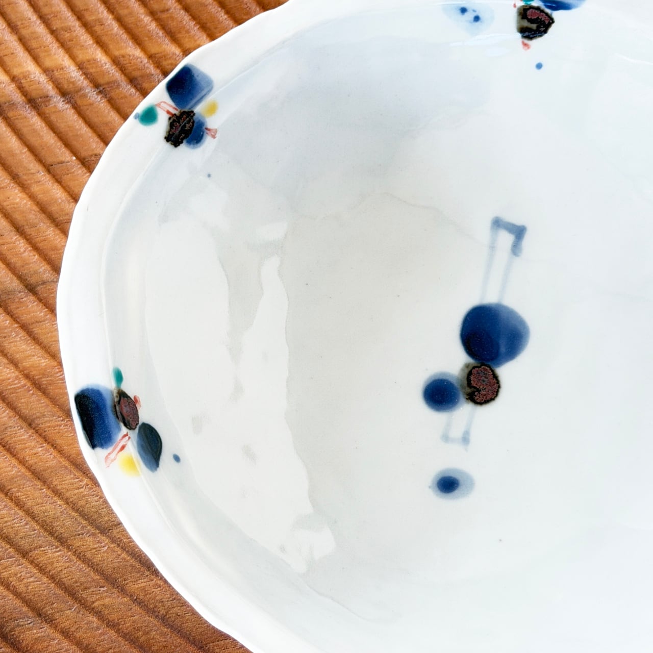 白磁のやわらかな余白の中に、染付の丸紋と錆色のアクセントを組み合わせた「染錦錆丸紋」の器です。にじみを含んだ藍の丸紋に、錆色が添えられることで、静かな中にも表情のある景色が生まれています。縁には小さく色絵が配され、全体を引き締めながら、どこか愛嬌のある佇まいに仕上がっています。