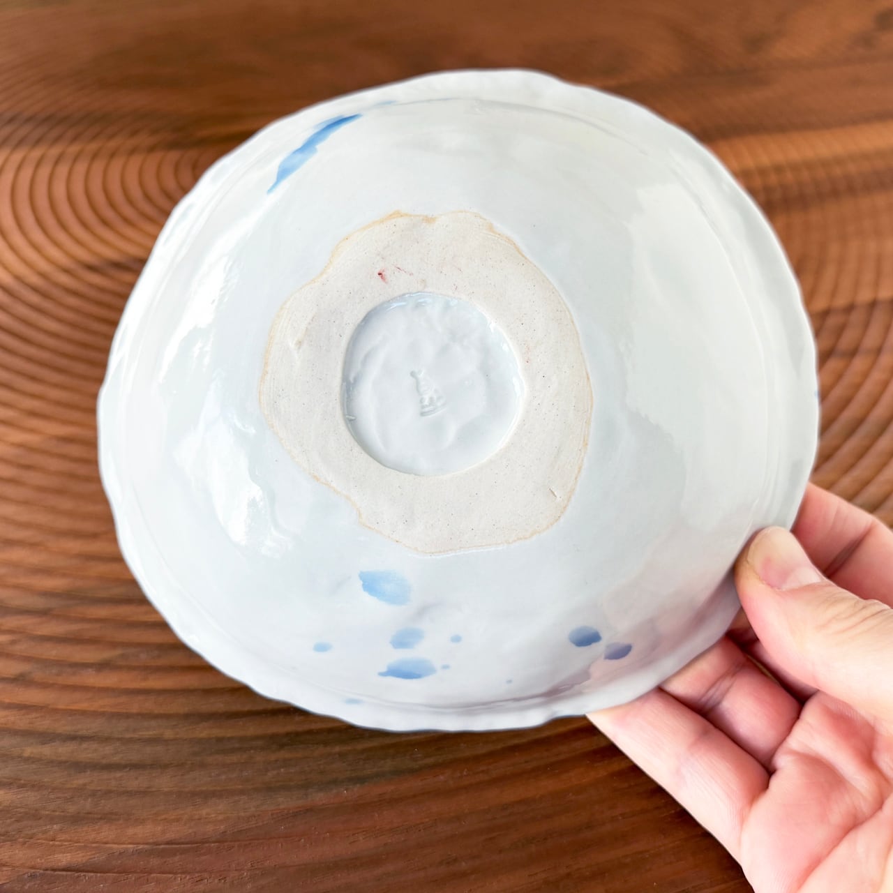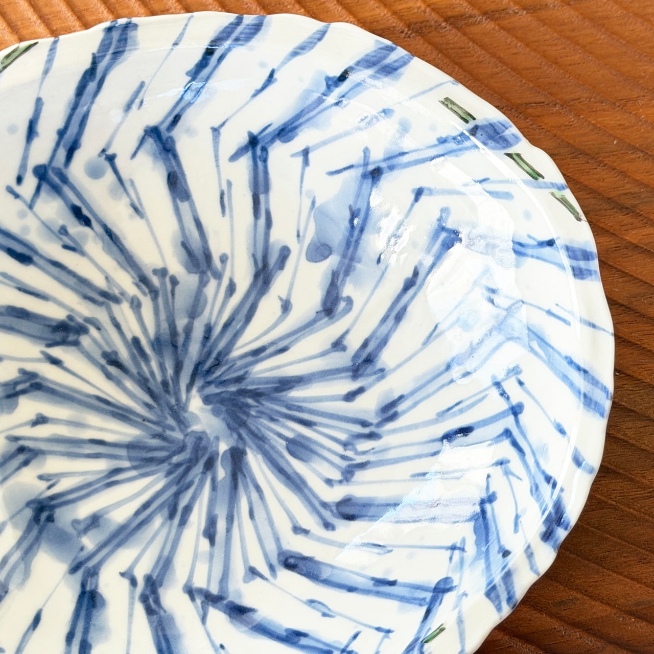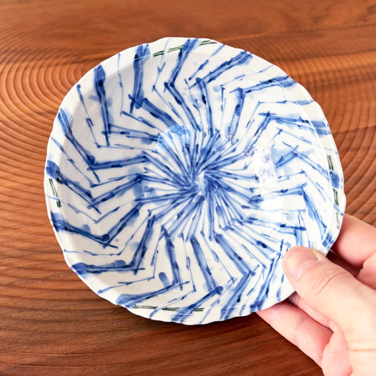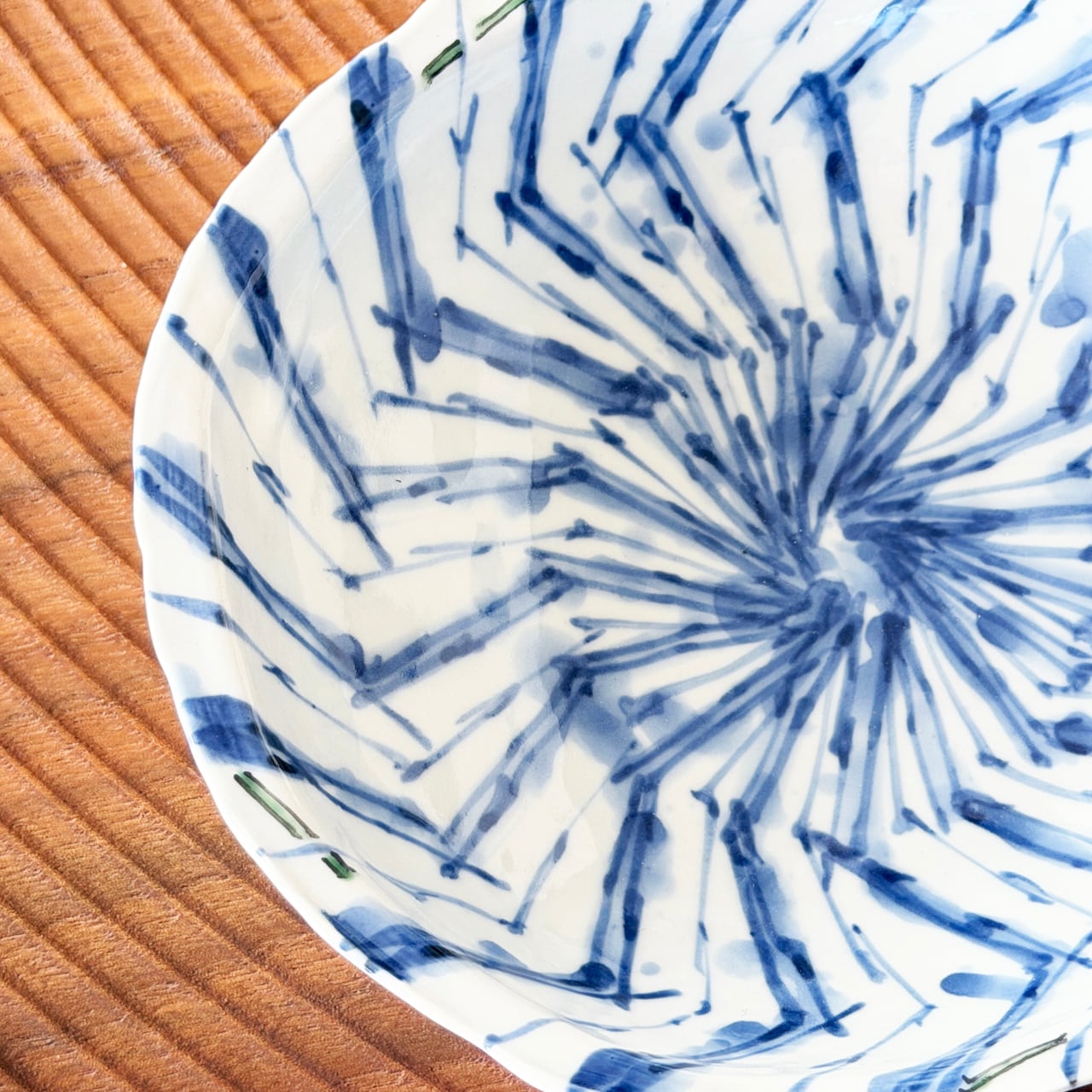 器の中心から外へ向かって、放射状に広がるように描かれた「吹き墨渦紋」の器です。