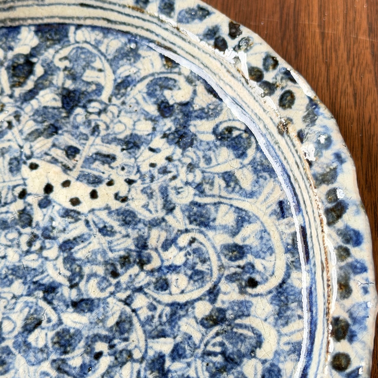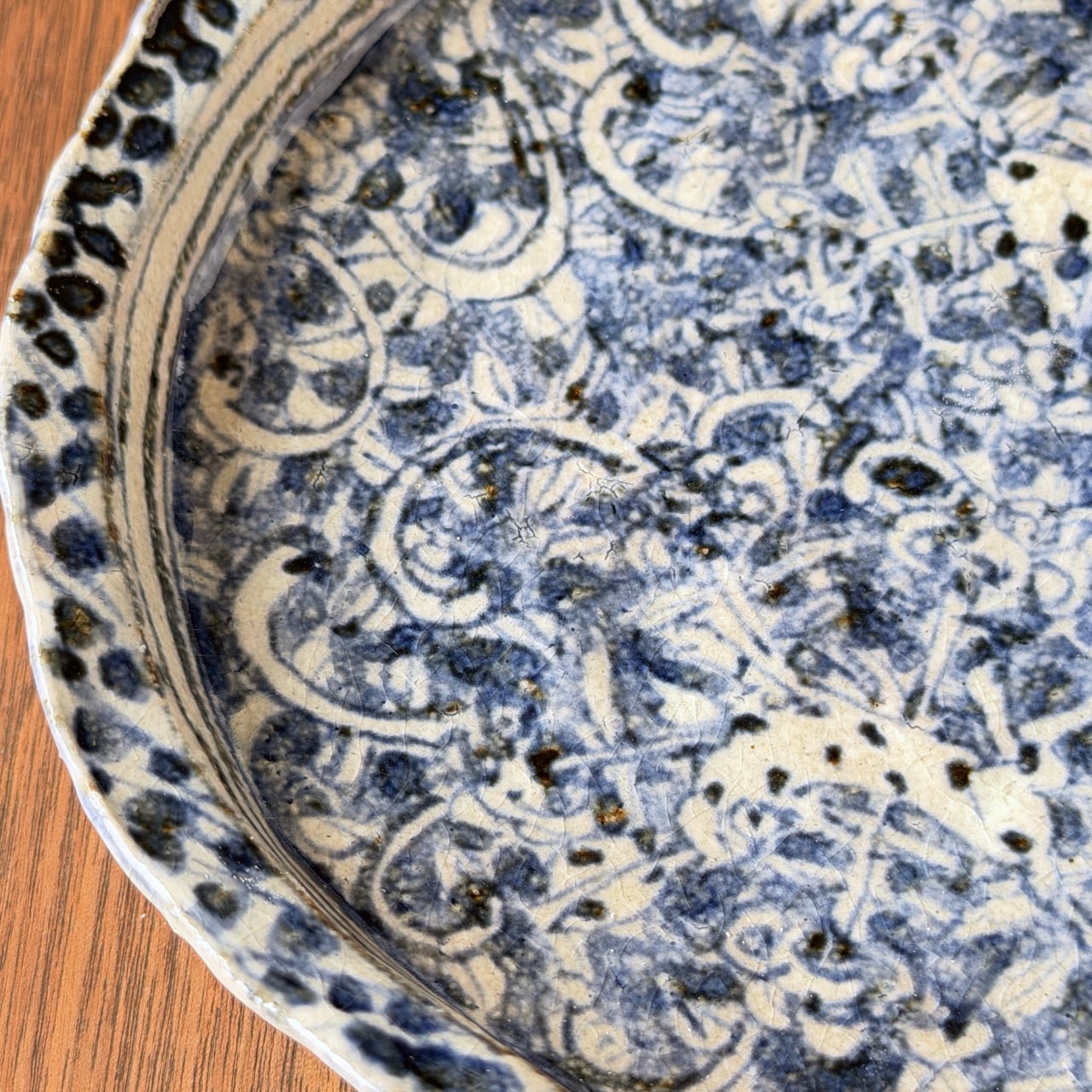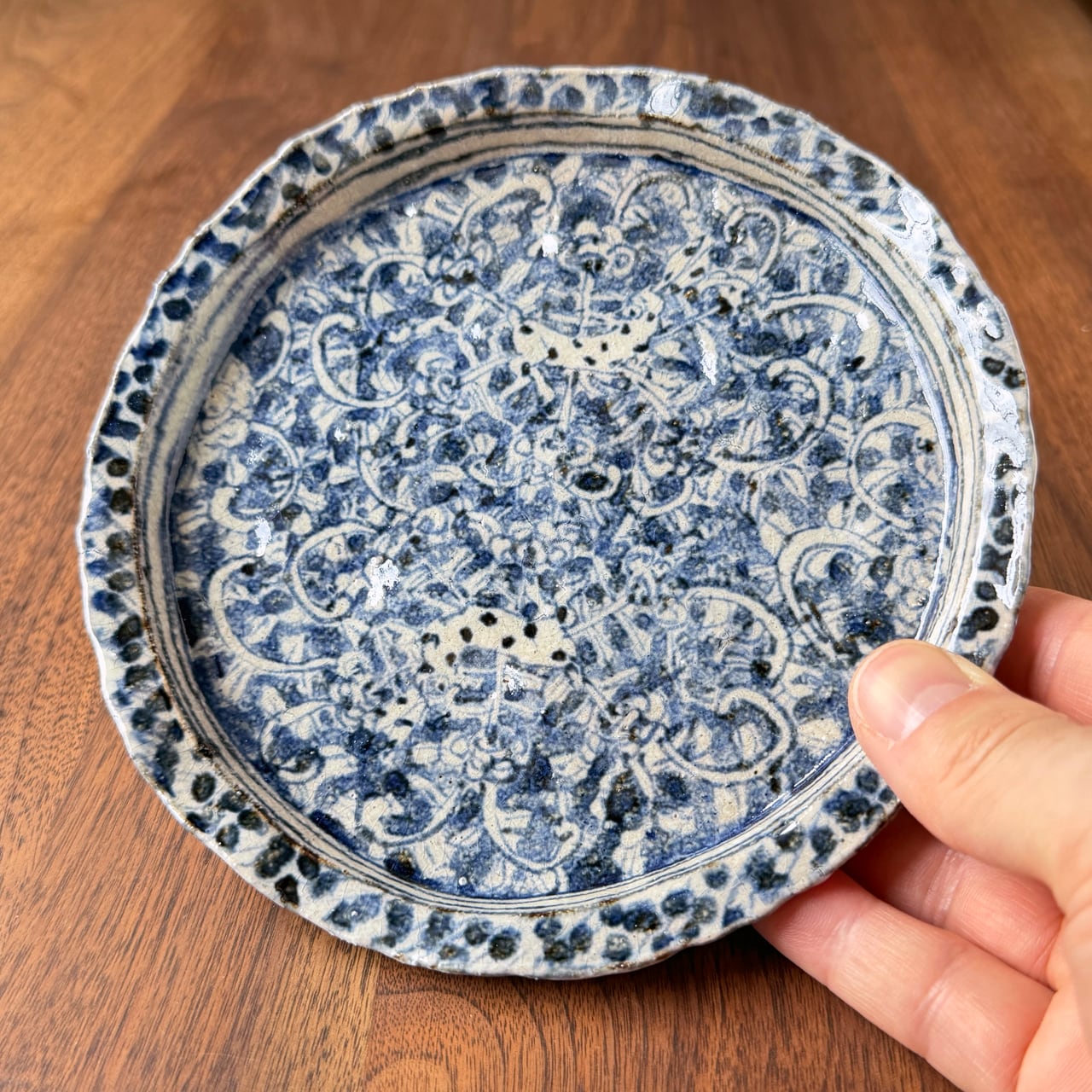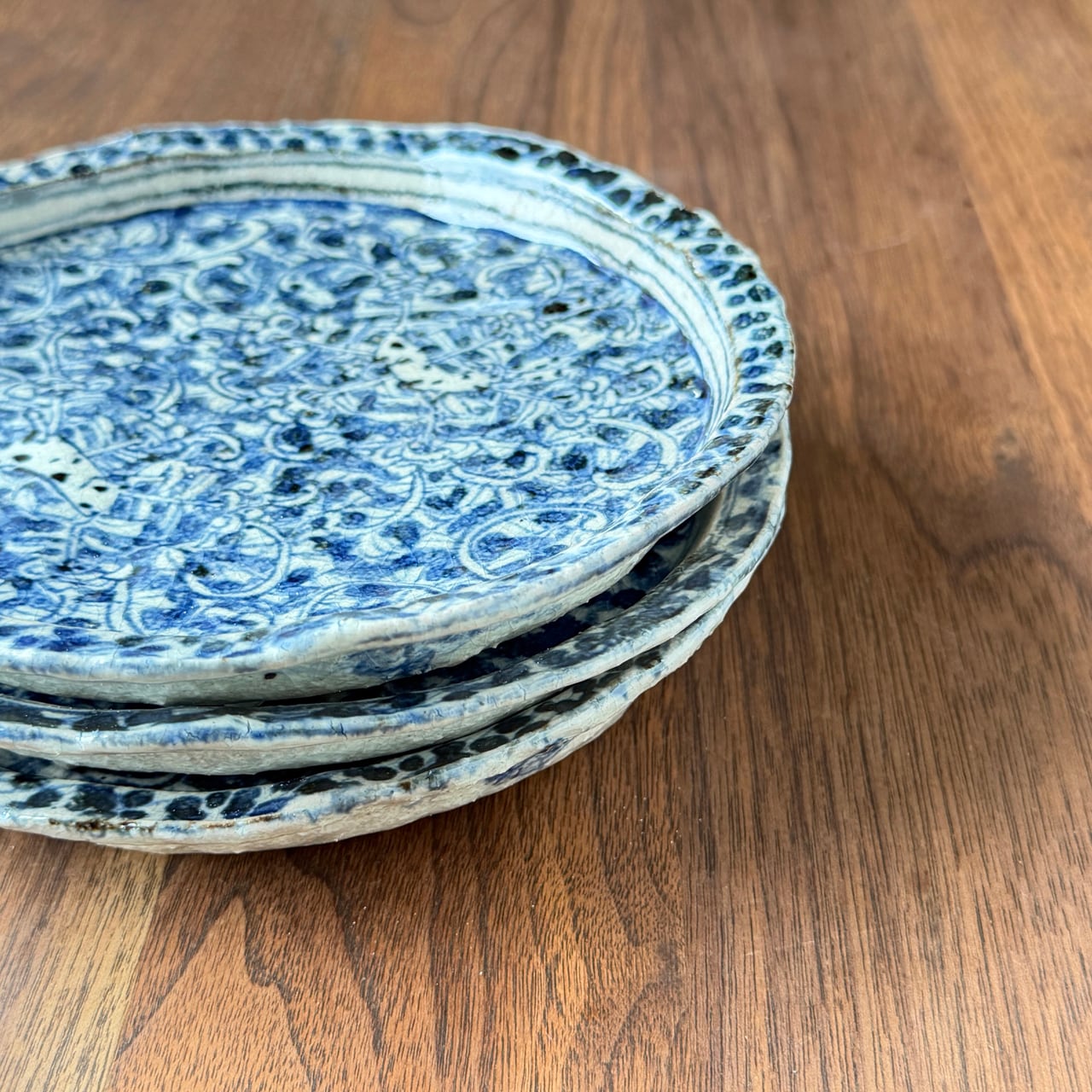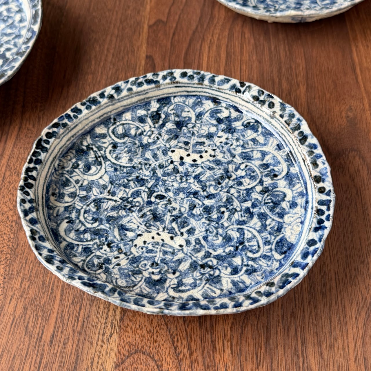 染付の濃淡やにじみが生み出す表情は一点一点異なり、使うたびに新しい魅力に気づかされる器です。荒土ならではのざらりとした質感と、染付のやわらかな青のコントラストも大きな魅力です。