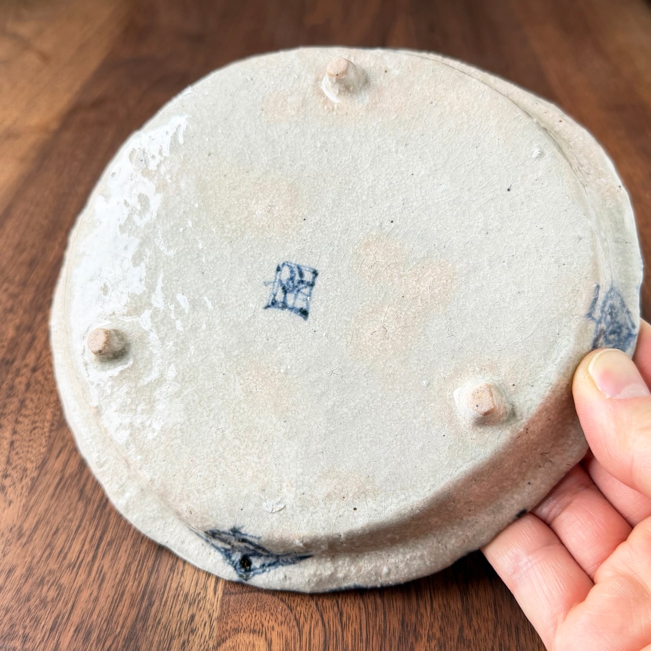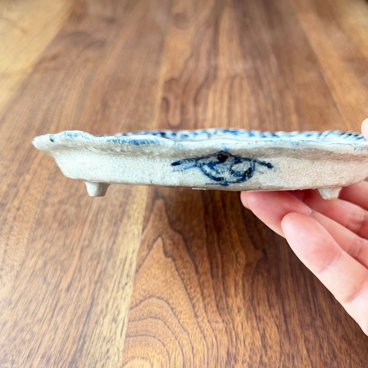 松尾貞一郎さん制作「三つ足付き丸皿 荒土染付兎」。