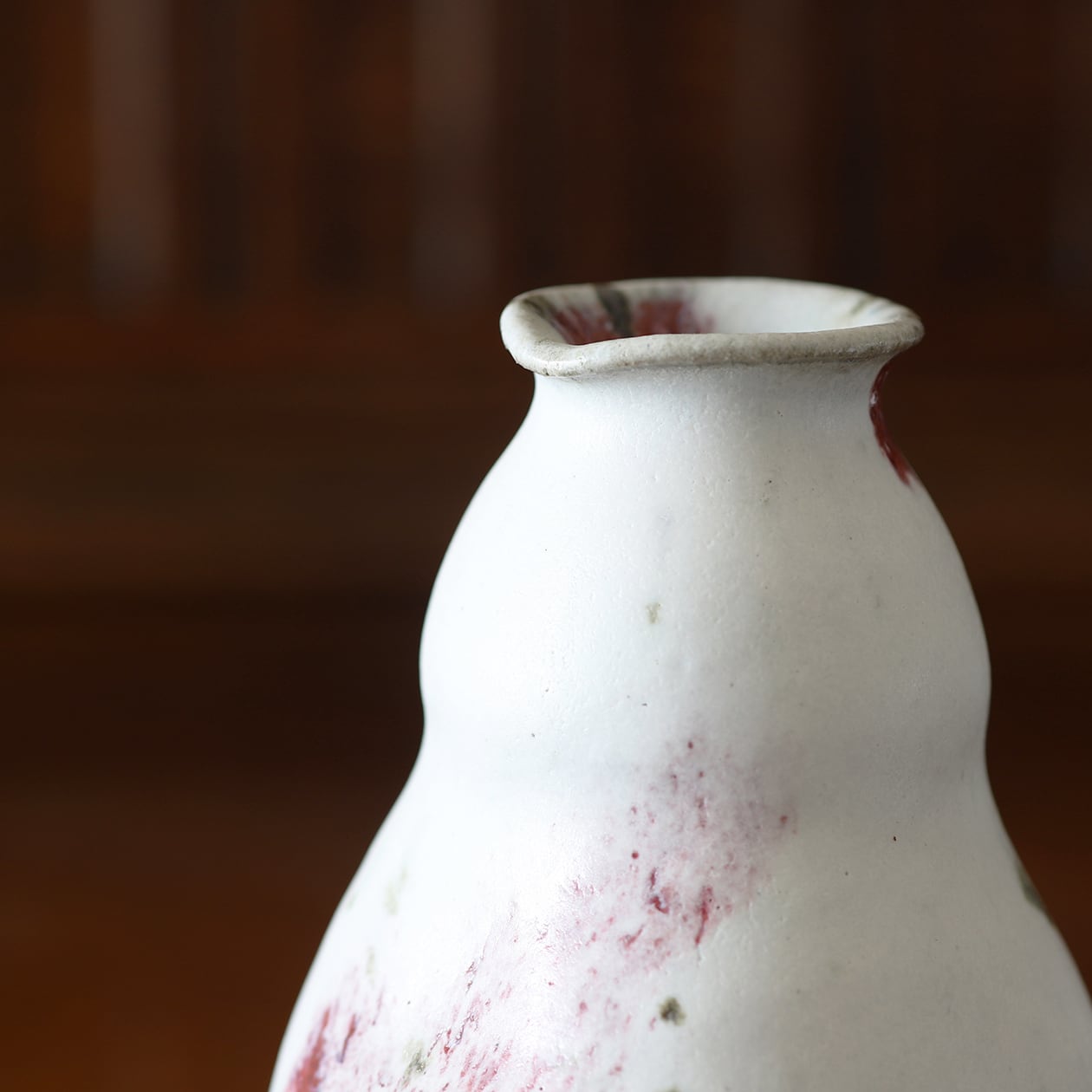 雪のような白釉に、うっすらと紅の色が浮かぶ、幻想的な作品。