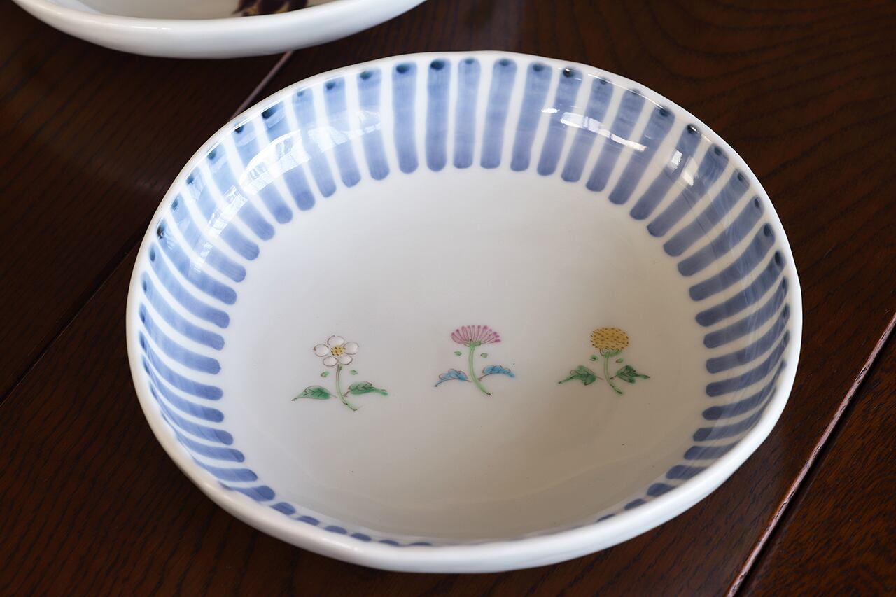 うつわの外側を太い十草を描き、中央に三つの花「ハクサンイチゲ、アザミ、ノゲシ」が描かれています。何とも可愛らしいデザインのうつわ。