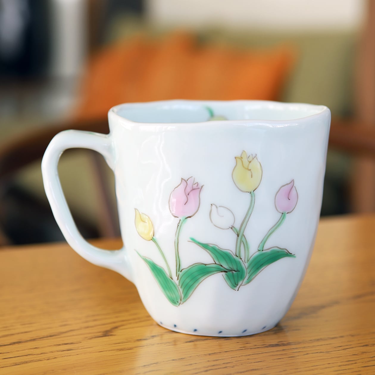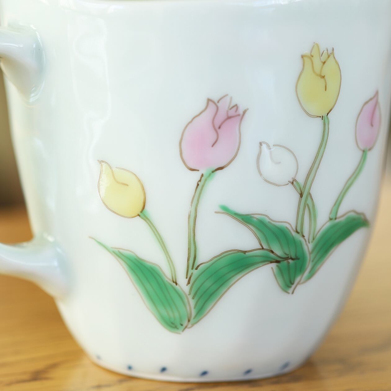ピンク、白、黄色のチューリップが描かれたこのデザインは、春の柔らかな雰囲気を器に閉じ込めたような愛らしさがあります。それぞれの花は丁寧に描かれ、鮮やかな色彩がまるで本物のチューリップのように生き生きとした印象を与えています。