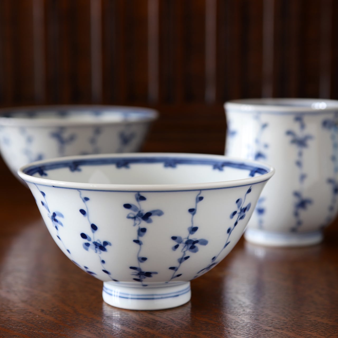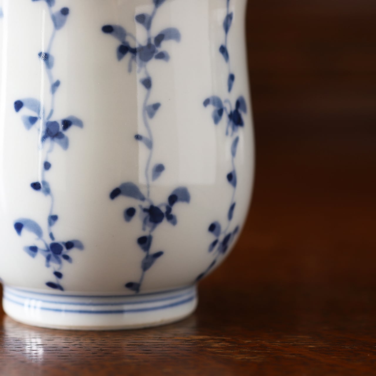 この「小花草紋」の模様は、お湯呑外側に淡い藍色で蔓植物を描いた、何とも優しいデザイン。毛筆で手描きをした、手描きならではの曲線が美しい絵付けの「小花草紋」です。