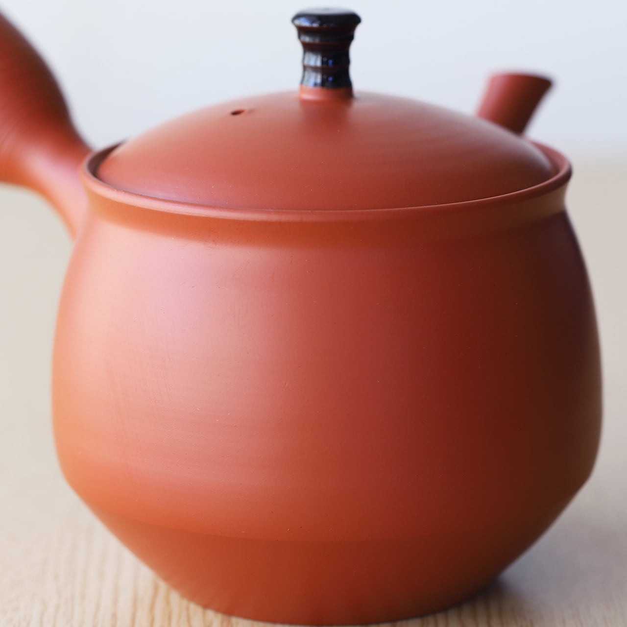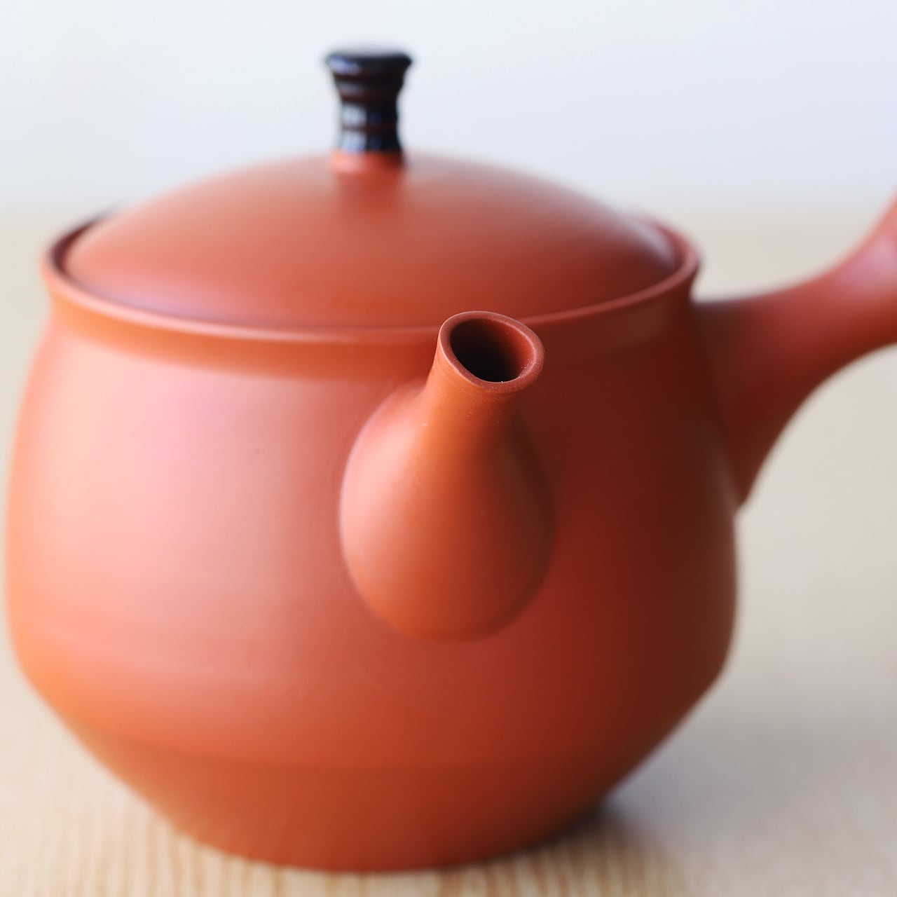 落ち着いた朱色がマットにしっとりと輝き、蓋のつまみにだけ黒い漆を塗って仕上げたオシャレな急須。