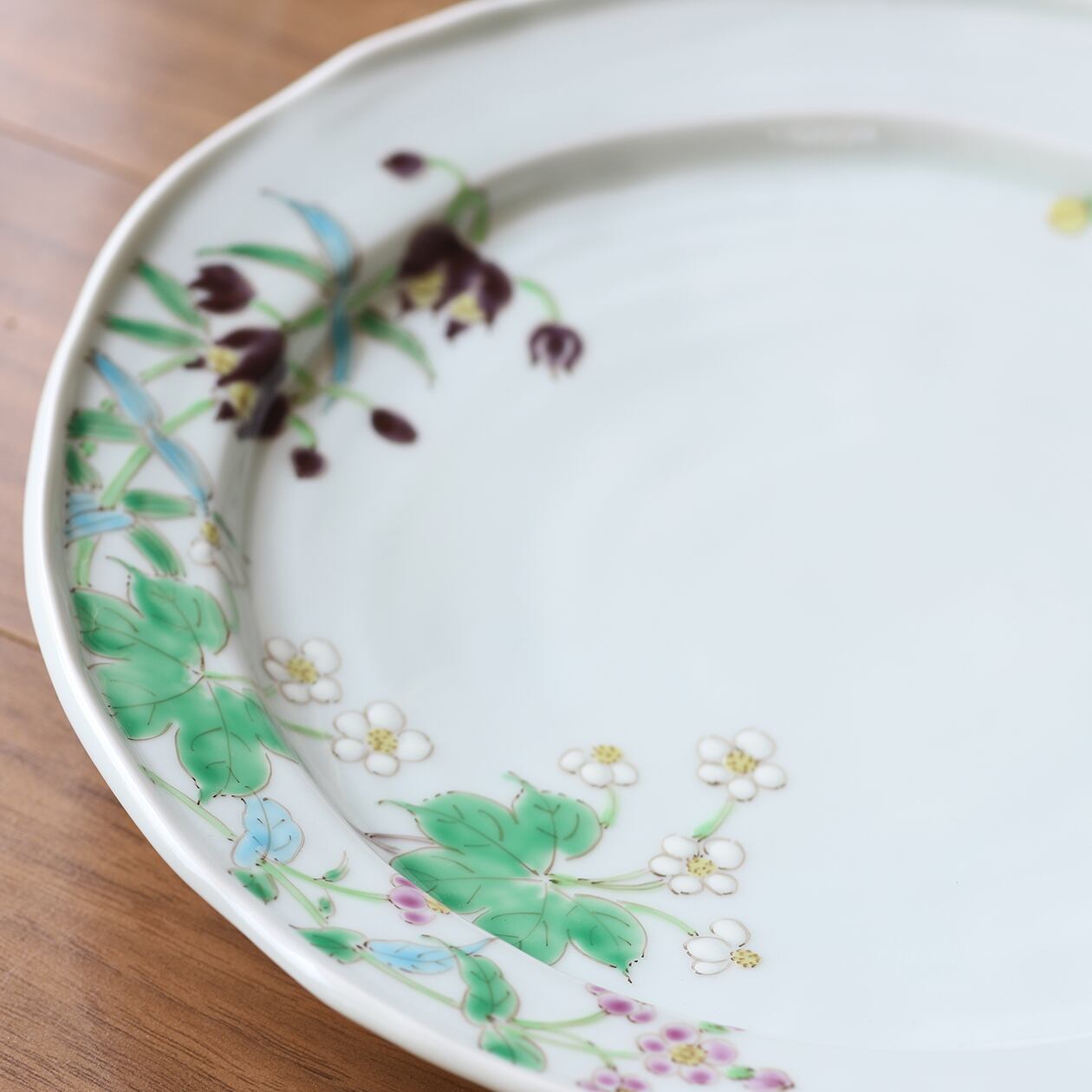 こちらはキツネノボタン、リンドウ、黒百合、ハクサンイチゲ、ルリハコベなどのお花を描いた「花づくし」の8寸皿です。