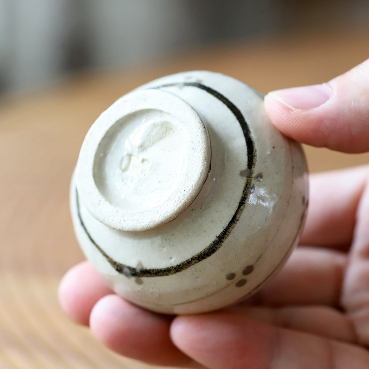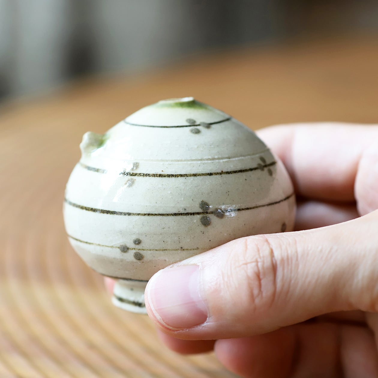 可愛らしい丸形に、駒筋を六段描き、グレーの小花もあちらこちらに加えられ、口部と最上部にだけアクセントとなるよう織部釉が施されています。